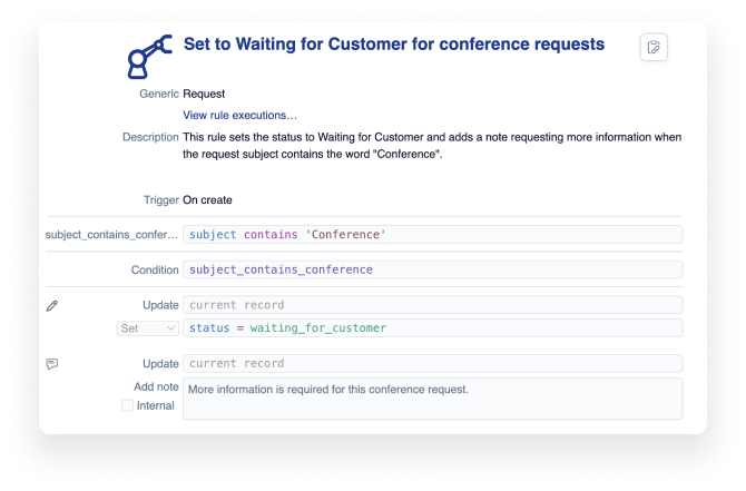Workflow automation: Rule engines examine preset triggers and events to orchestrate actions that execute predefined processes without human intervention. In a nutshell, that's workflow automation.
