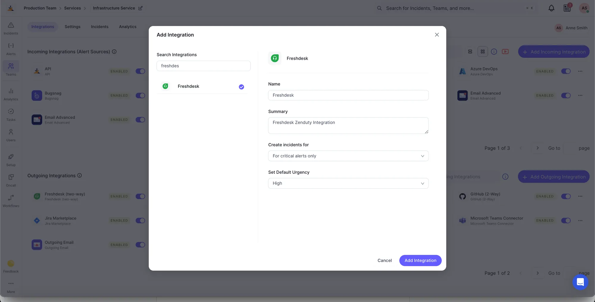 Click on "Add Integration" and select "Freshdesk" from the list of available integrations.