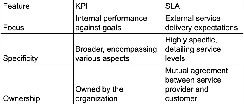 - Scope: SLAs cover broader service aspects, while KPIs focus on specific metrics.