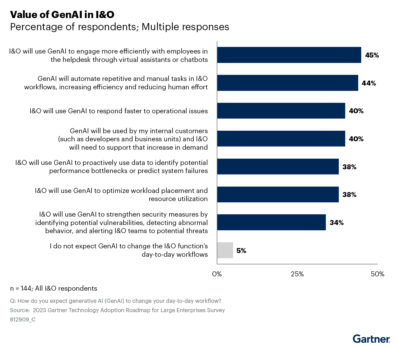 - 45% of respondents indicate that “I&O [Infrastructure & Operations] will use GenAI to engage more efficiently with employees in the helpdesk through virtual assistants or chatbots.”
