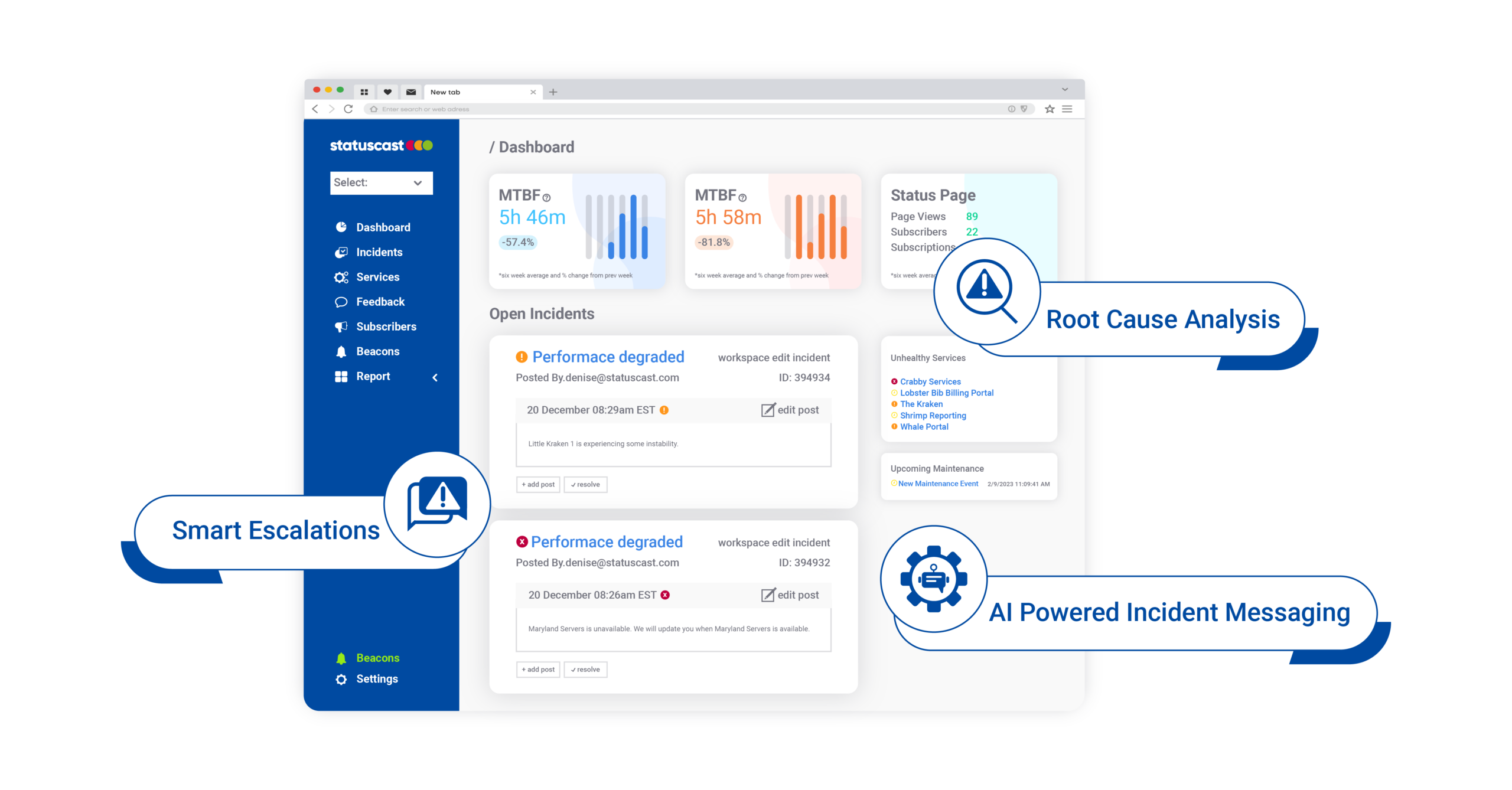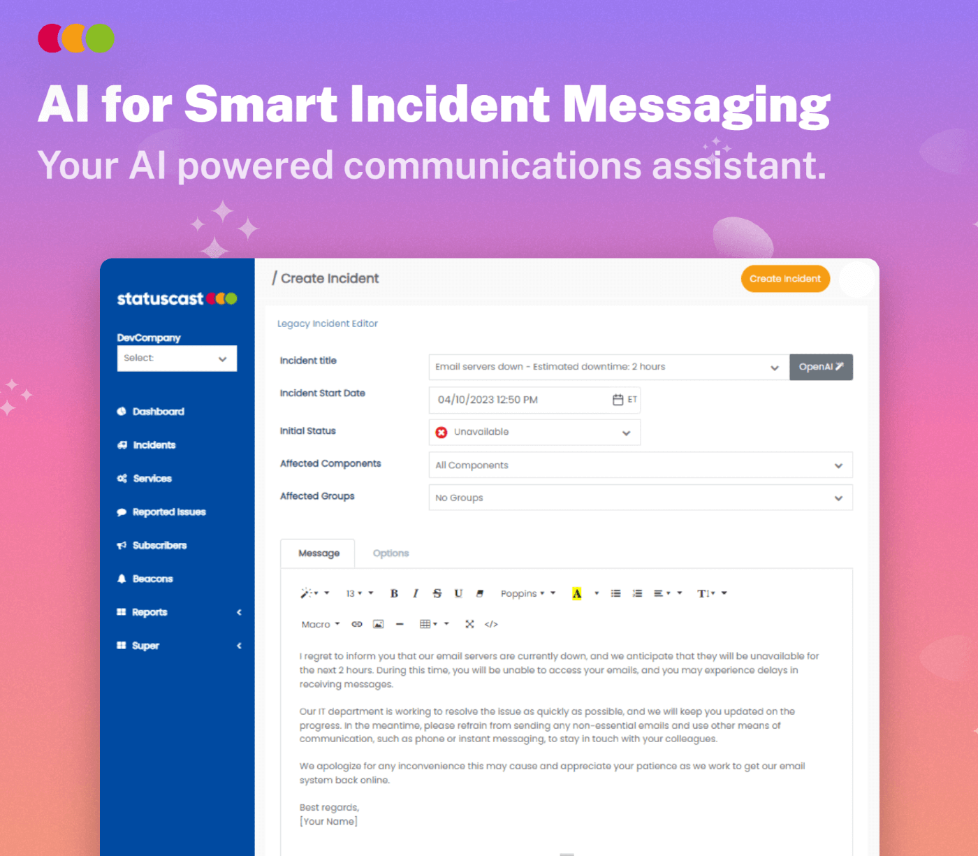 StatusCast status pages offer real-time updates with visually appealing, audience-specific status pages, powered by AI for intelligent incident messaging and automated content generation.