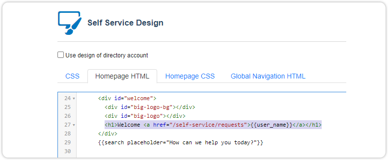 As an example, the following code in the ‘Self Service Design’ section of the Settings console uses the {{user_name}} widget in a link pointing to the ‘Requests’ section that lists the user’s requests: