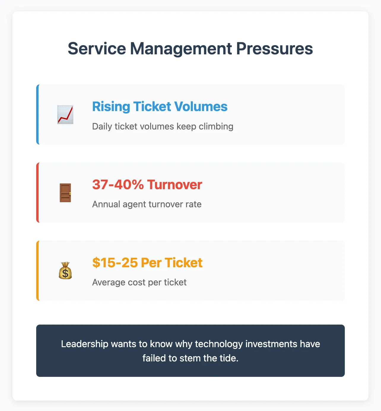 Service management teams everywhere face the same mounting pressures. Daily ticket volumes keep climbing while agent turnover rates hover around 37-40% annually. The average cost per ticket has reached $15-25, and leadership wants to know why technology investments have failed to stem the tide. AI adoption in enterprise IT is now widespread and seen as strategically essential for enhancing IT operations and support processes, but organizations still face significant challenges when implementing AI in IT service management, including integration complexity and change management.