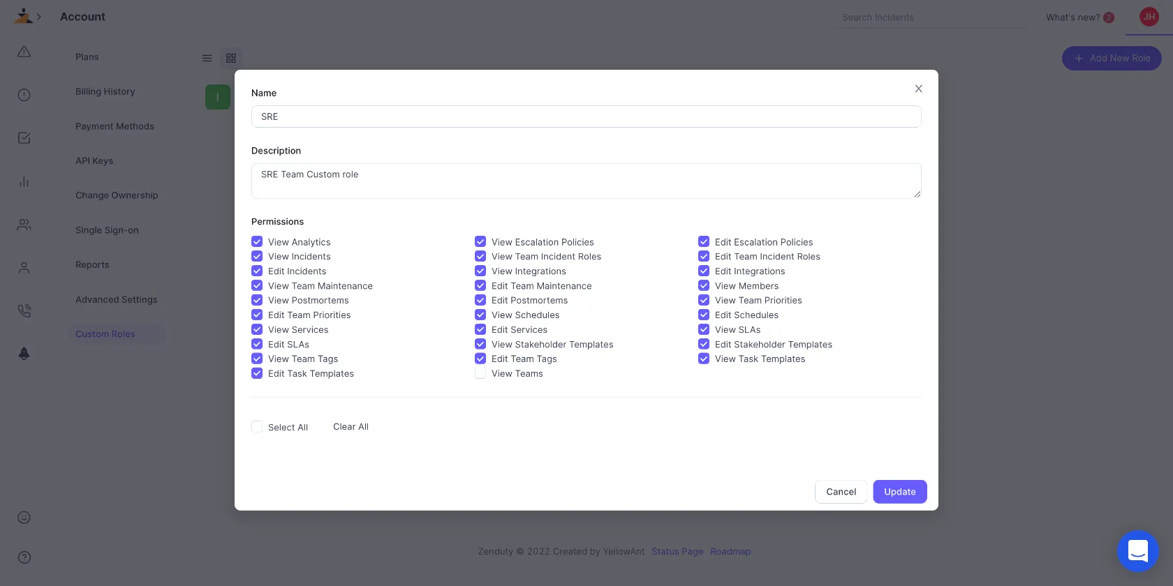 Account admins will now be able to create account-level “Roles”. By default, there are three fixed roles within the account - Owner, Admin and User. Custom roles allow you to define permissions that certain users can have within teams that they are not part. For example, a central Major Incident team within and organization can have read/write access to incidents within any of the organization’s team.