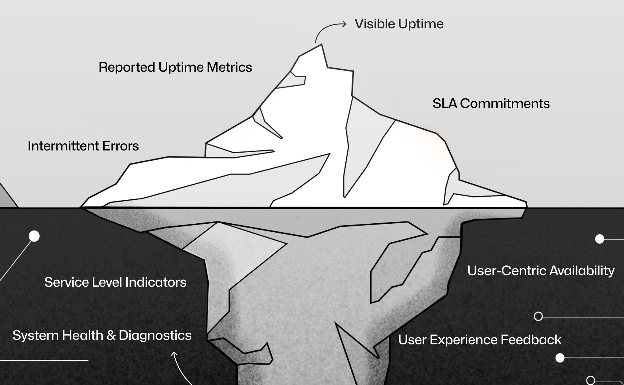 Uptime shows that servers, networks, or applications are running and meeting basic health checks. But, IT teams often use terms like "five-nines" to communicate a high level of operational reliability but it only tells a part of the story. Here’s a visual representation of the iceberg that we kept mentioning throughout the blog. Save it.