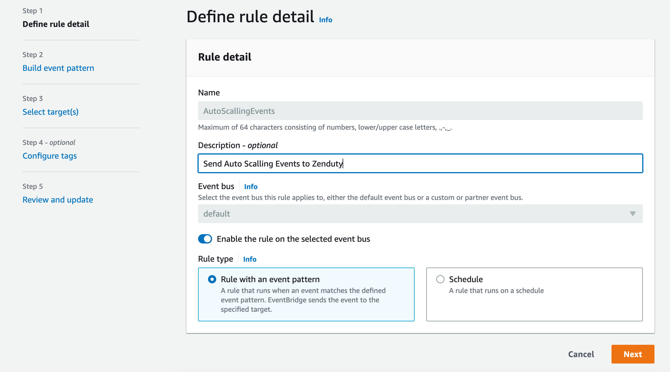 2. Go to the AWS EventBridge dashboard. On the left panel, click on Rules. Click on Create rule. For name enter Xurrent IMR and description as per your preference.