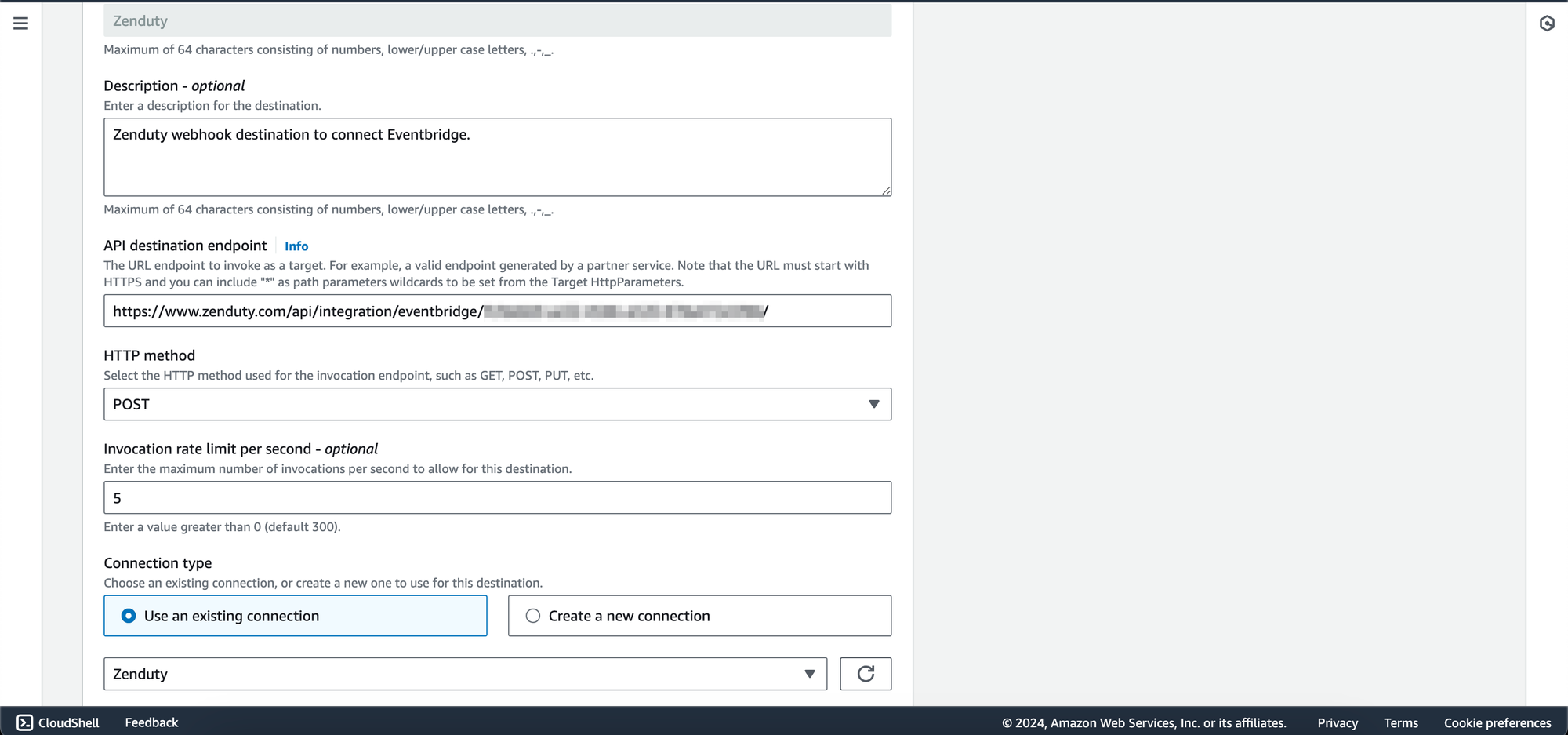 2. Provide Name and Description. For the "API destination endpoint", paste the webhook URL you copied earlier from Xurrent IMR and select POST as the HTTP method. Enter 5 as the Invocation rate limit per second.