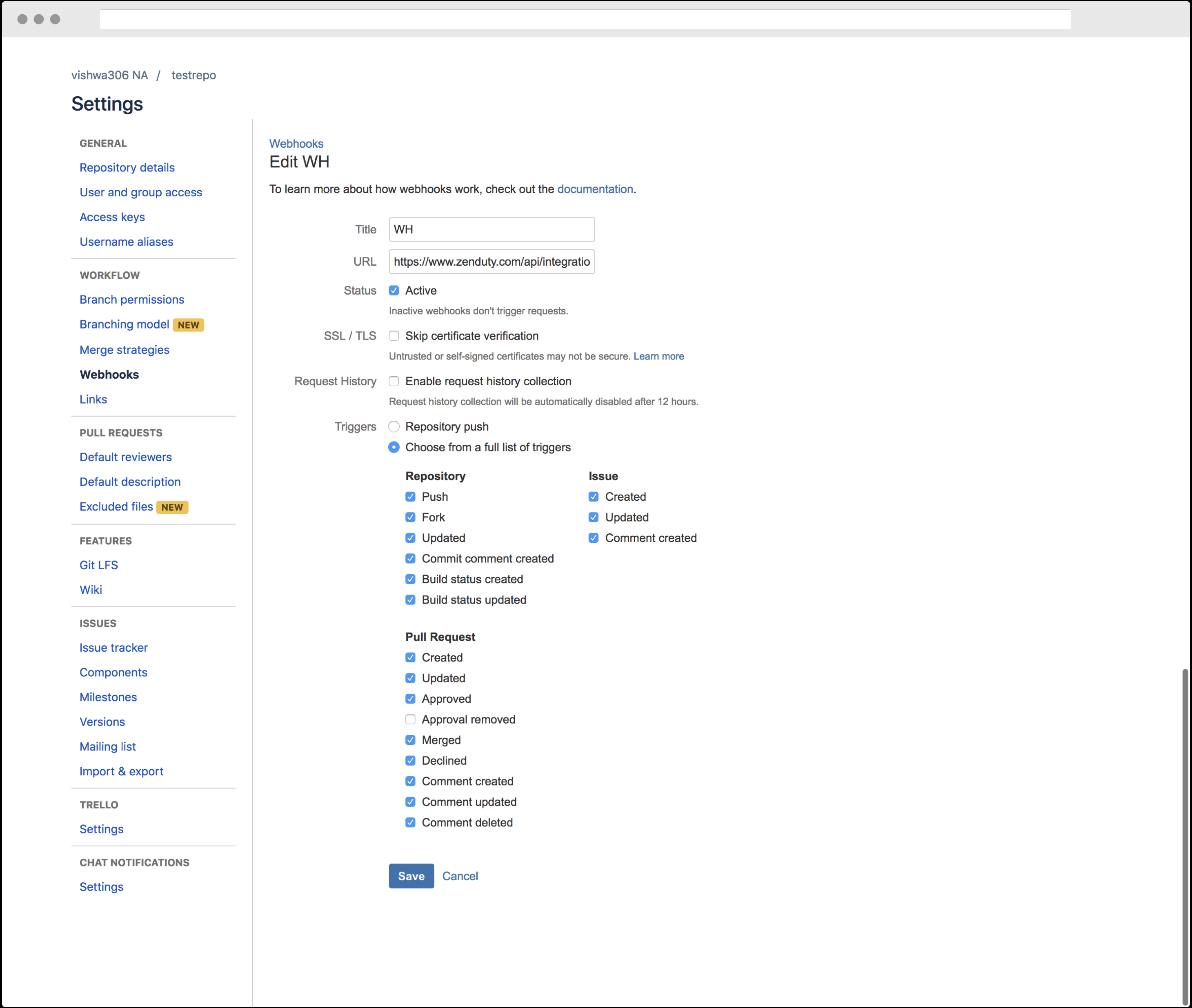 - Go to Integrations and then Add New Integration. Give it a name and select the application Bitbucket from the dropdown menu.
