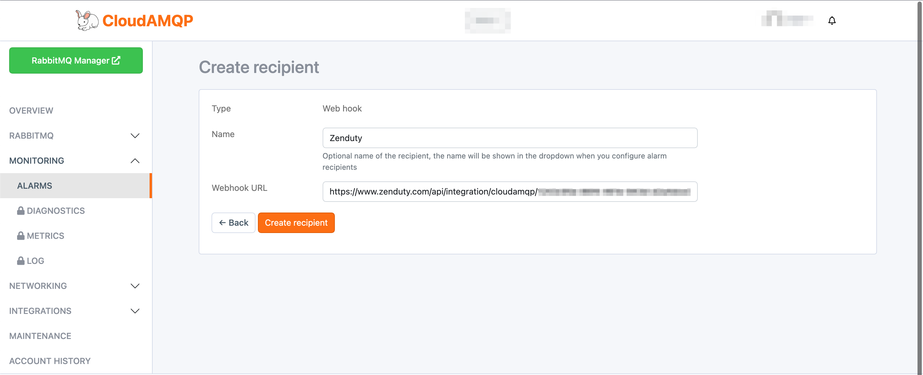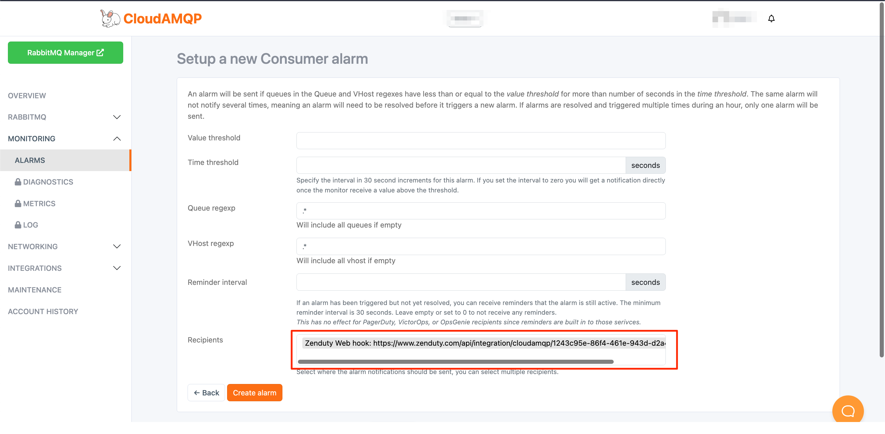 - Create a new alarm or open an already created alarm and select the above webhook as Recipients.