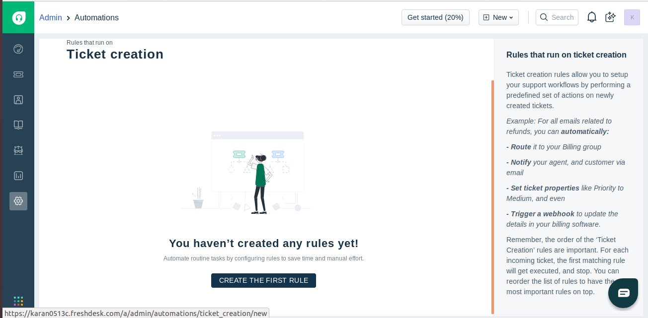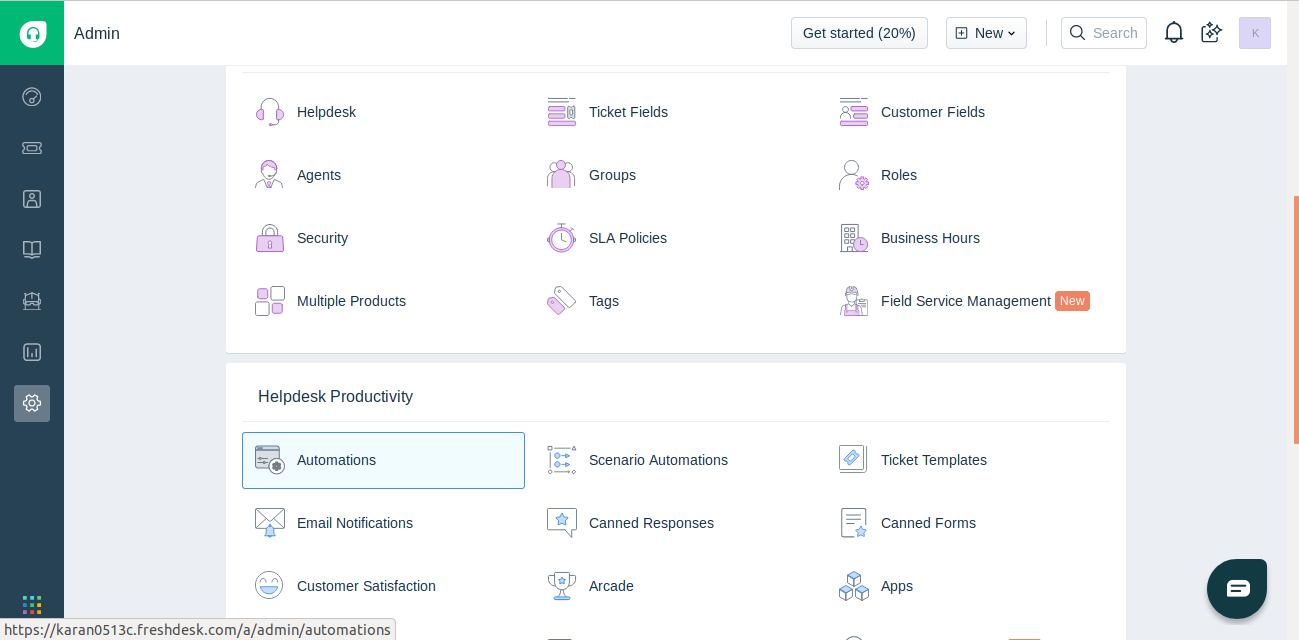 - Log into Freshdesk. Click on the Admin button and select Automations under Helpdesk Productivity Settings.