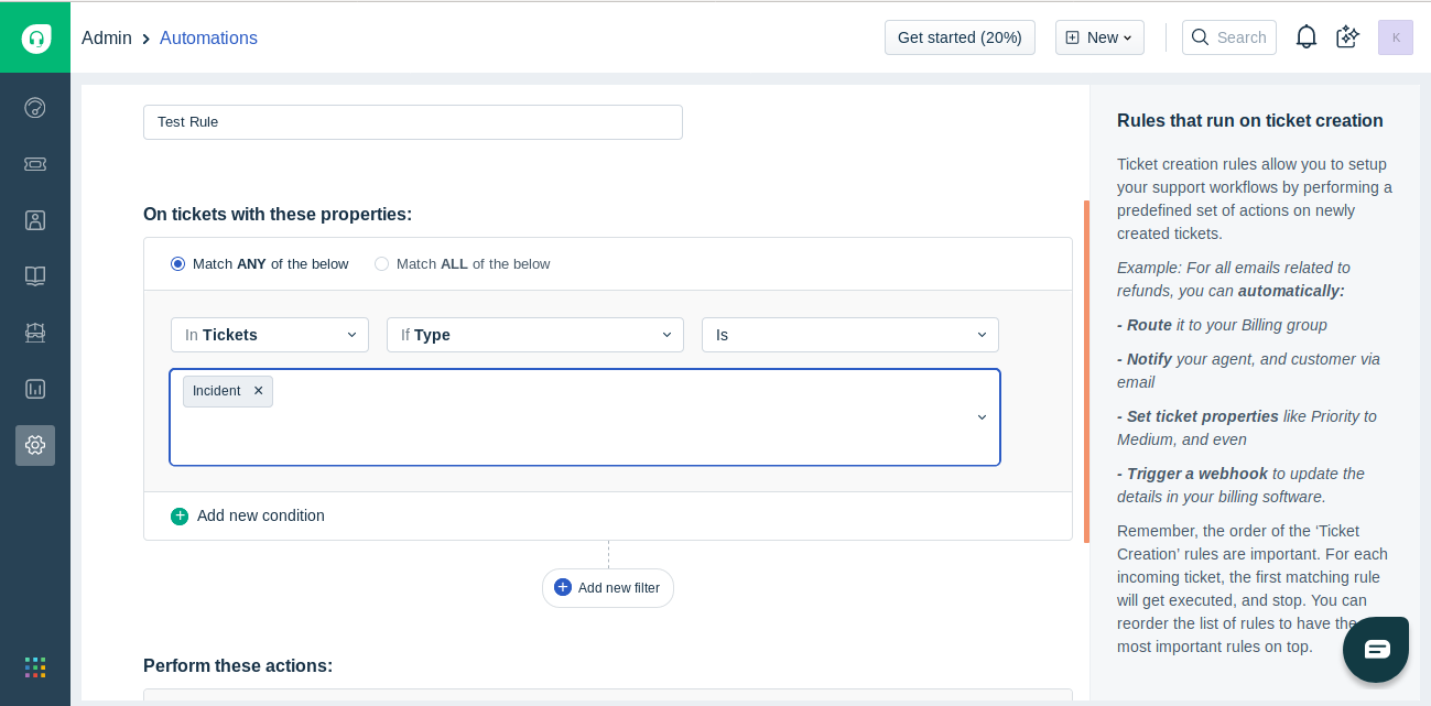 - In the On tickets with these properties section, set condition as Type Is and Incident.