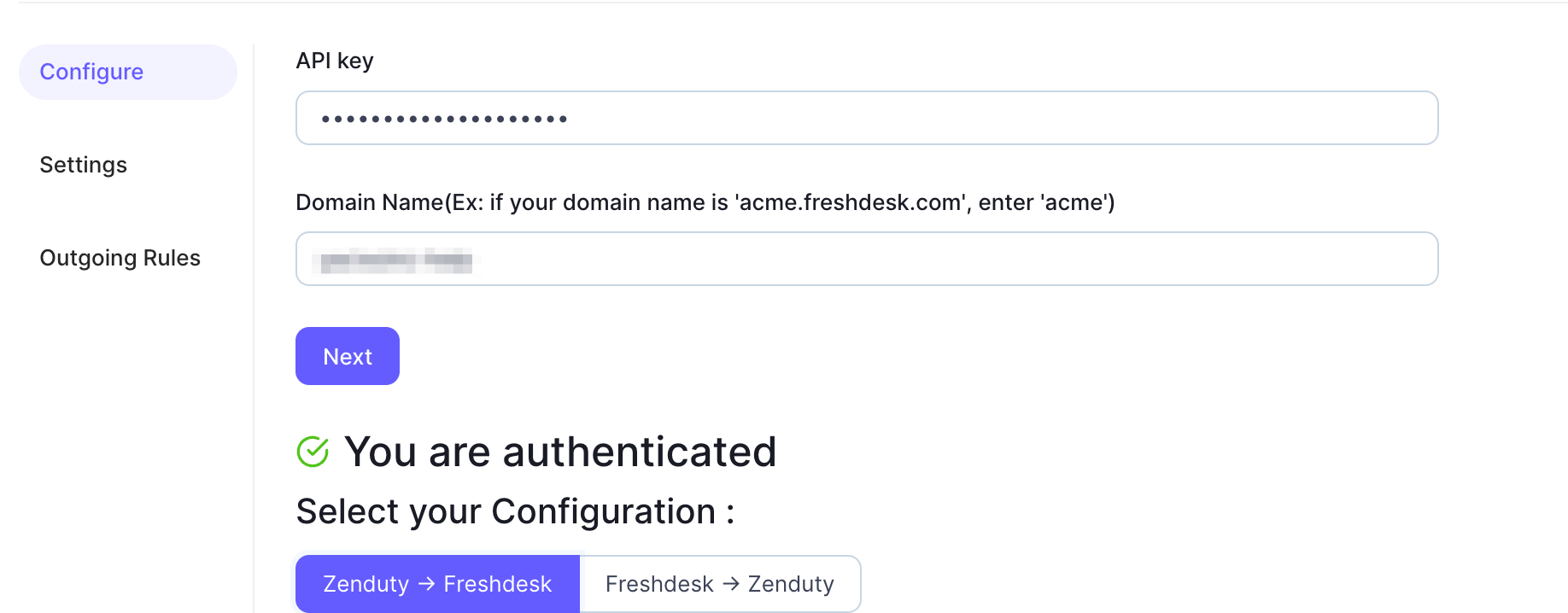 - Go back to the Xurrent IMR Freshdesk(two-way) settings tab, and under Domain name, enter your Freshdesk domain name. For example, if your Freshdesk URL is acme.freshdesk.com, then your domain name is acme.