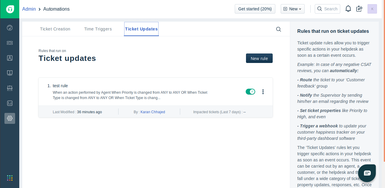 - From the same window, move to Ticket Updates sections and click on New Rule button.