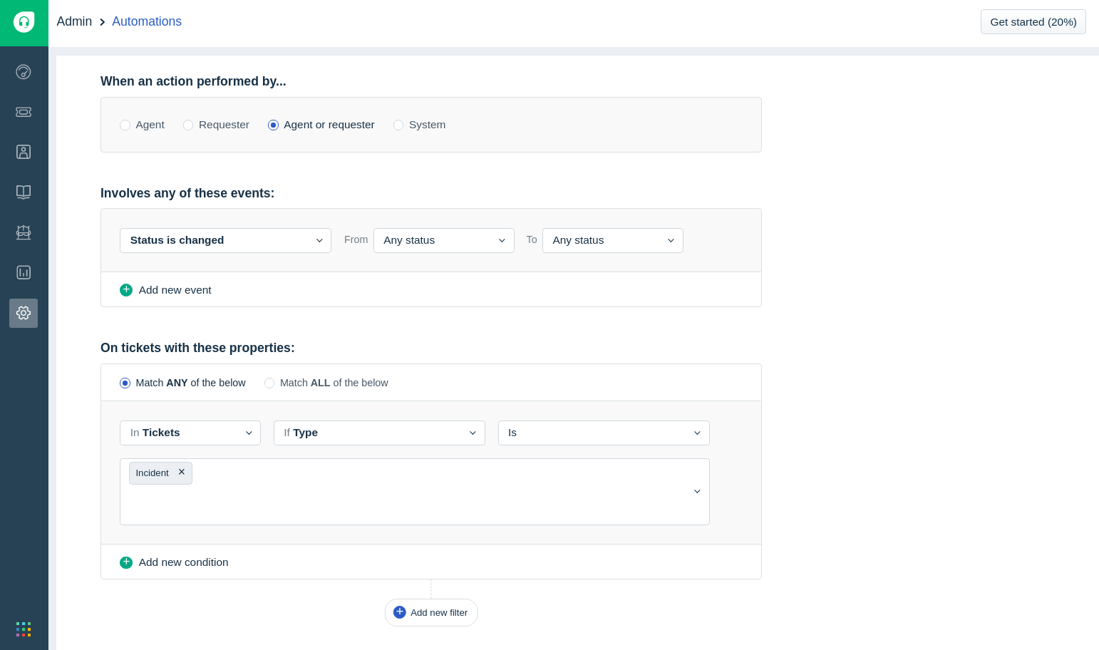 - Set When an Action Performed By to Agent or Requester. Then set Involved any of these events for Status is Changed from Any Status to Any Status.