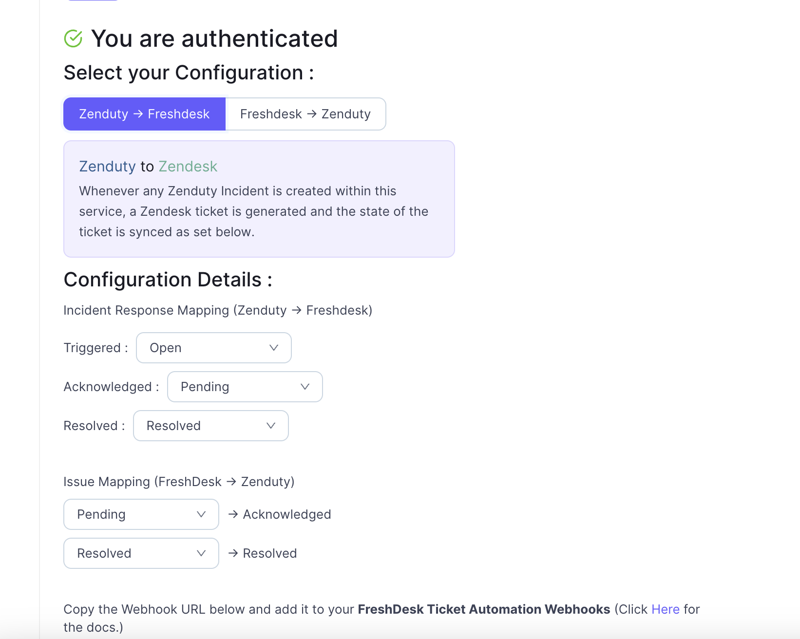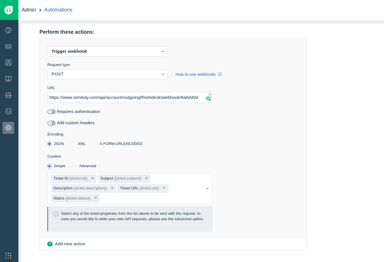 - Copy the generated Webhook URL to be applied onto FreshDesk.