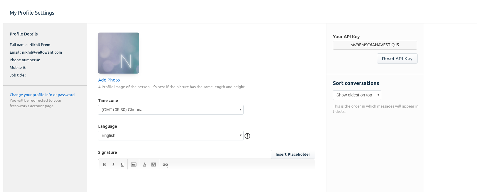 - Open a new tab and to your Freshdesk page and copy your API token from the My Profile Settings page.