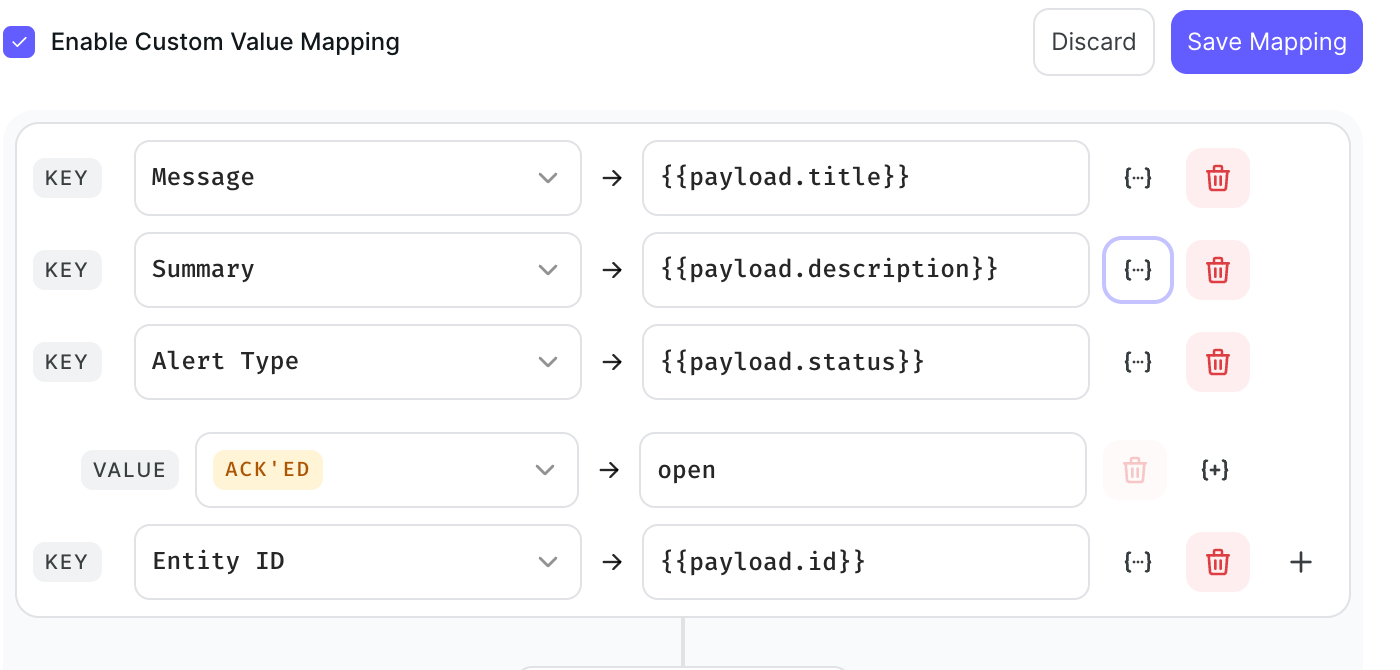 Enabling Custom Value Mapping will change how payloads are processed, which could affect your existing alert rules. Any rules referencing payload keys (e.g., {{payload.source}}) must now use the updated format: {{payload.payload.source}}.