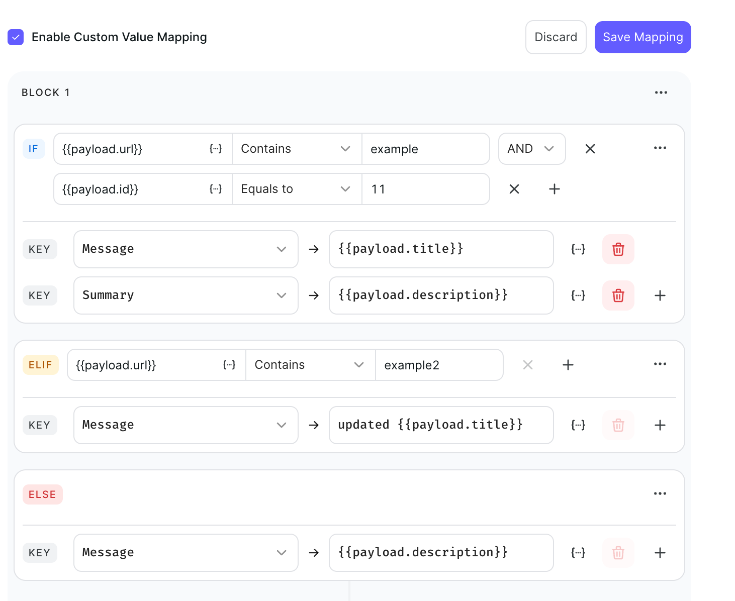 With dynamic payloads, you can now assign multiple values to your keys using conditional logic. This provides greater flexibility to accommodate varying payload structures.