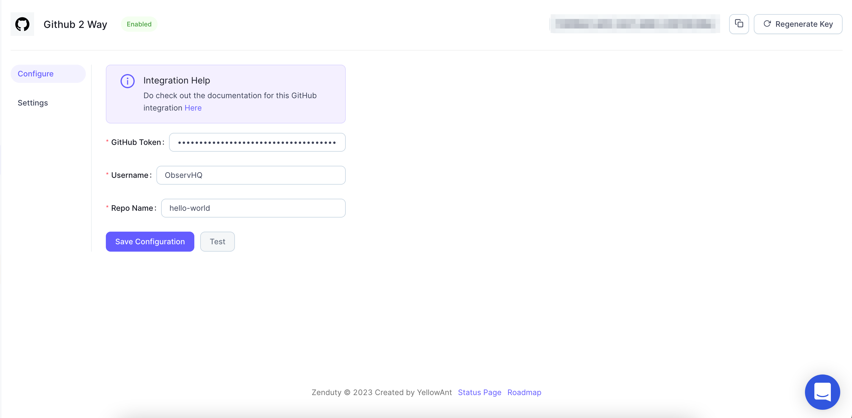 1. Click on Save Configuration to save the details. Click on Test to create a test issue on Github and verify the connection.