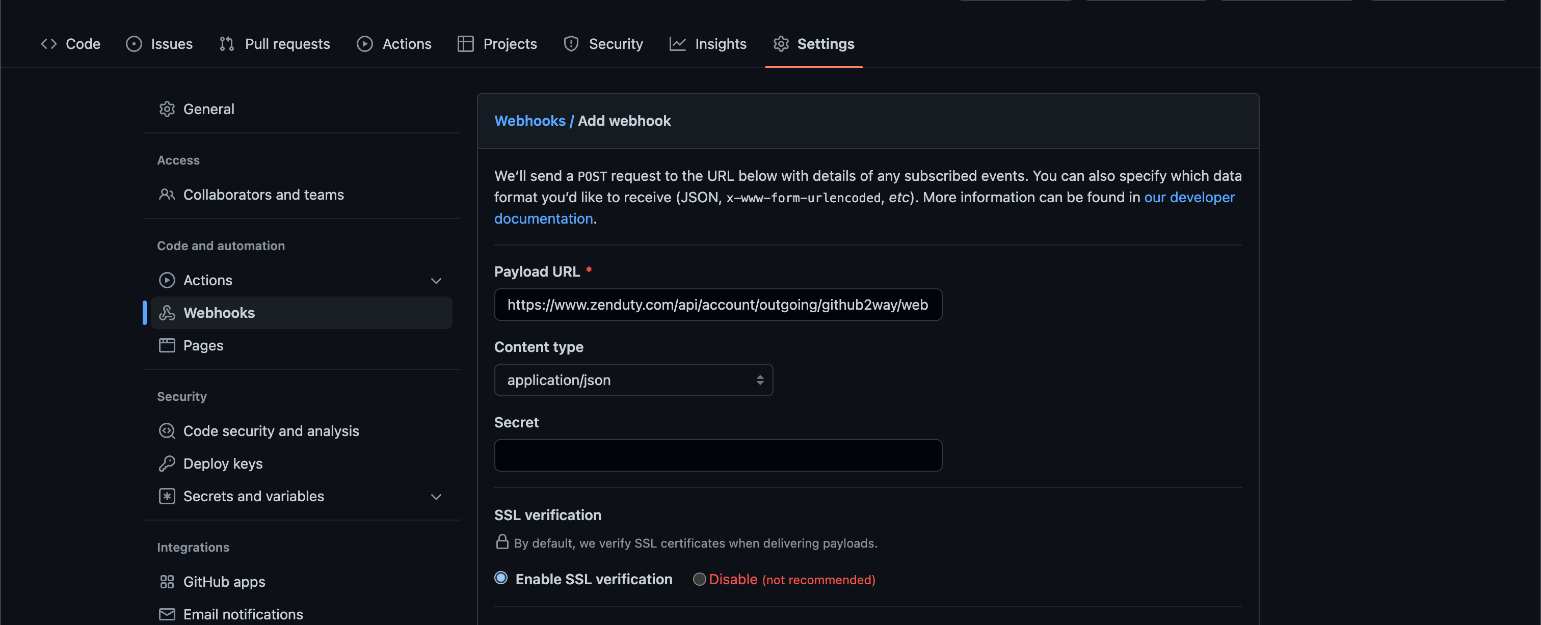 1. In the Payload URL input box, paste the Integration URL you copied earlier.