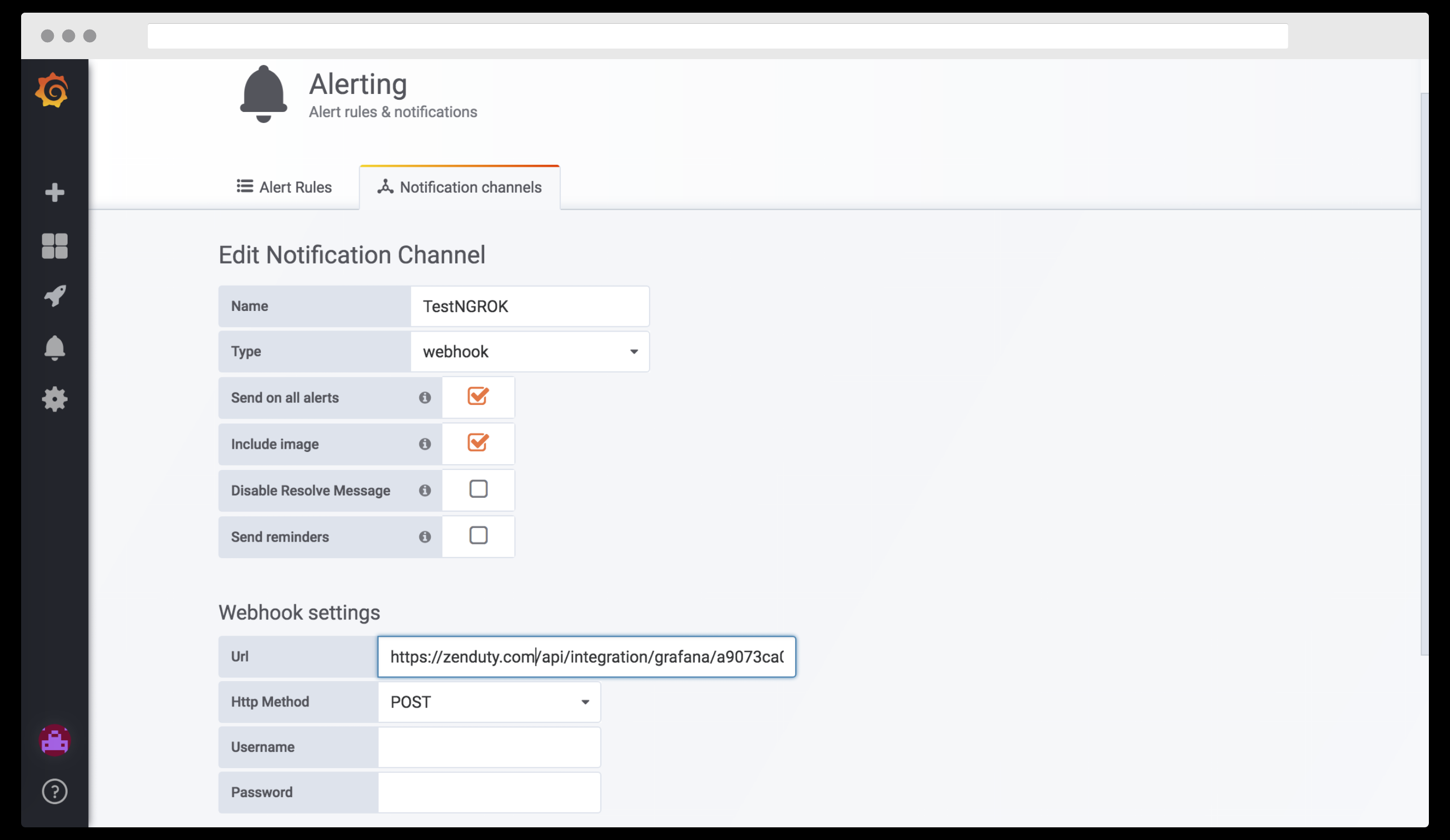 1. Log in to Grafana. Go to 'Notification Channels' -> Add New Channel -> Select type as Webhook.