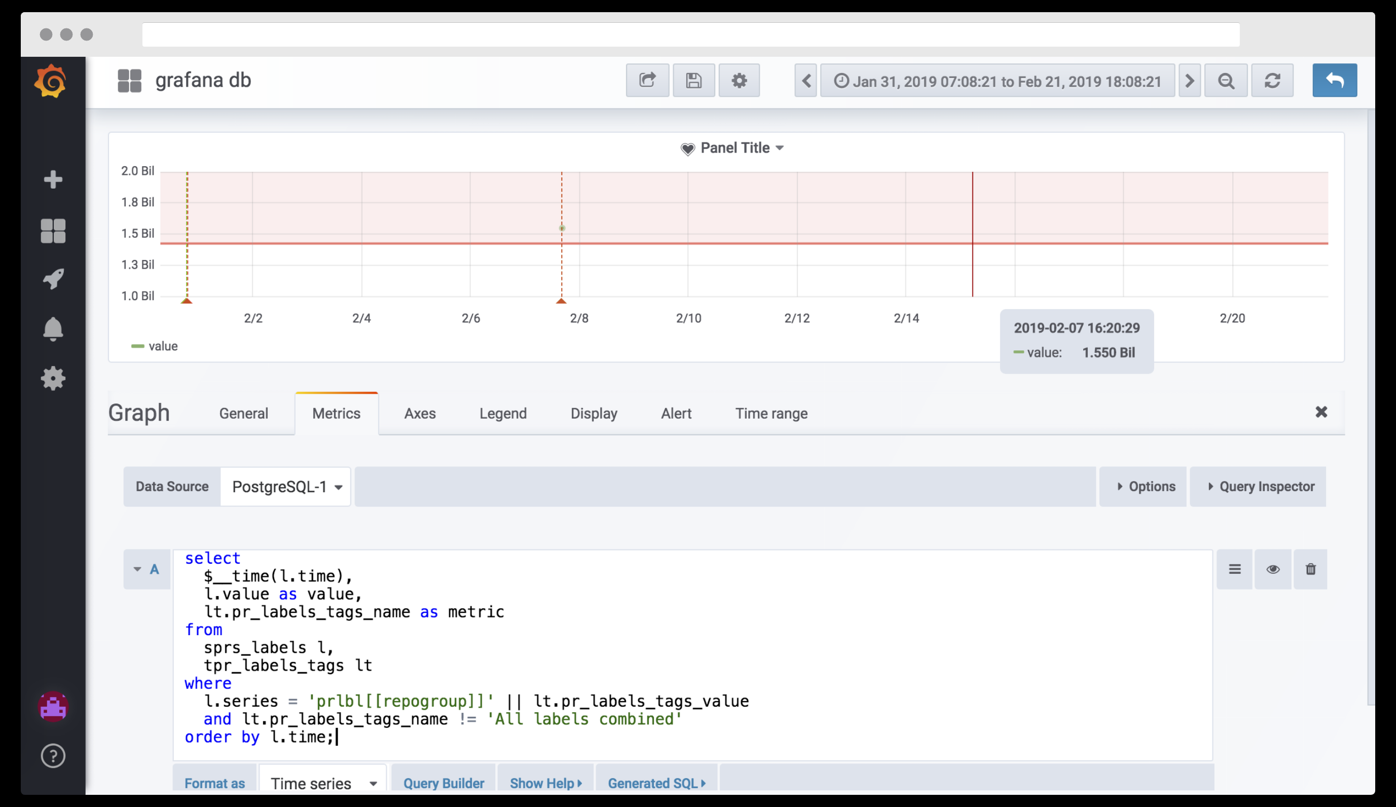 Grafana is a multi-platform open source analytics and interactive visualization web application. It provides charts, graphs, and alerts for the web when connected to supported data sources. It is expandable through a plug-in system. End users can create complex monitoring dashboards using interactive query builders.