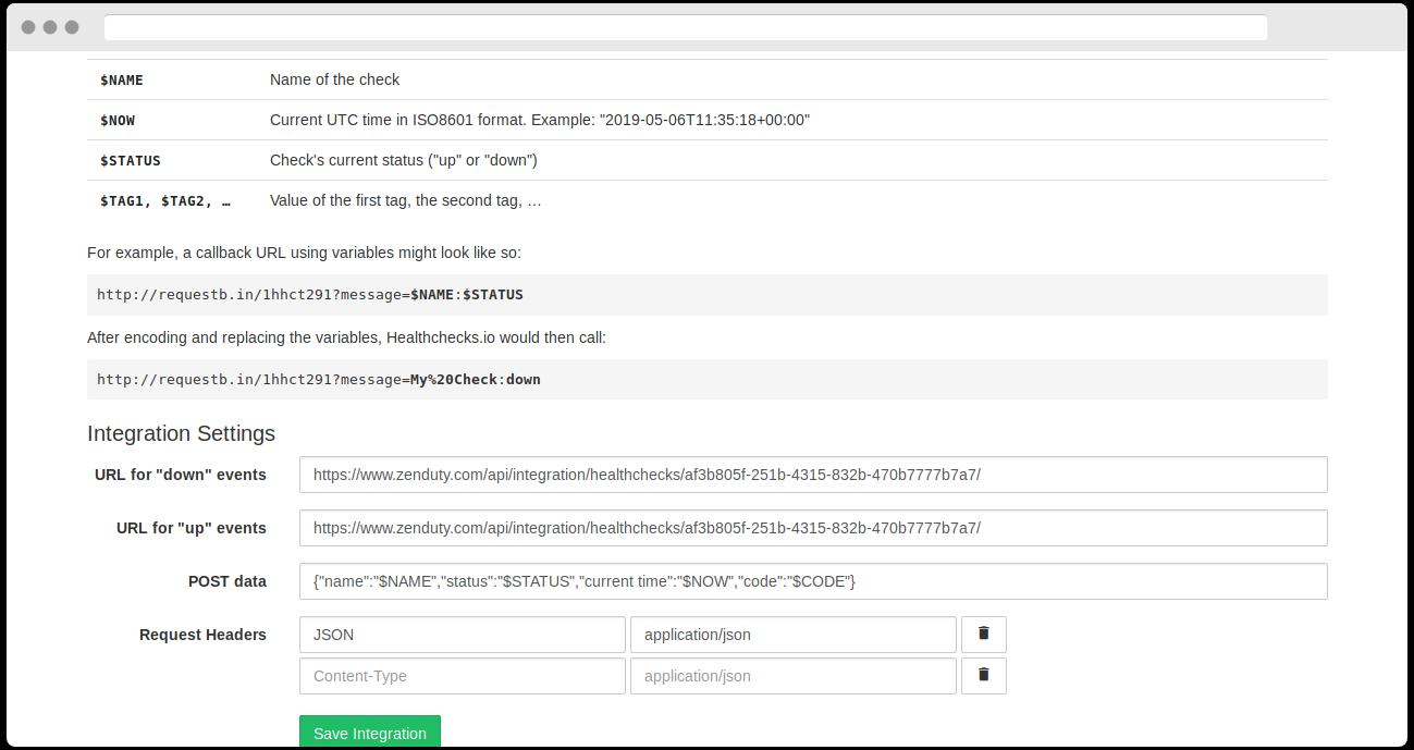 1. Paste the link copied earlier in URL for down events and up events under the Integration settings.