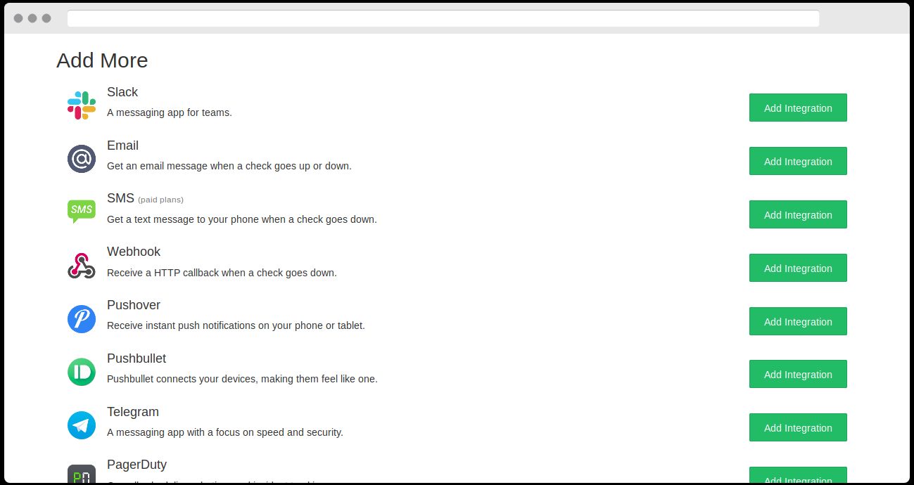 3. Go to Integrations and then Add New Integration. Give it a name and select the application Healthchecks from the dropdown menu.