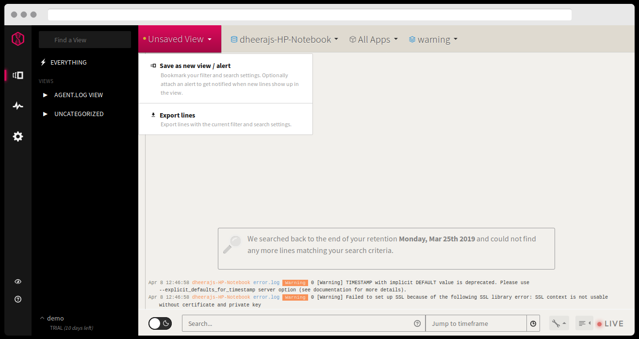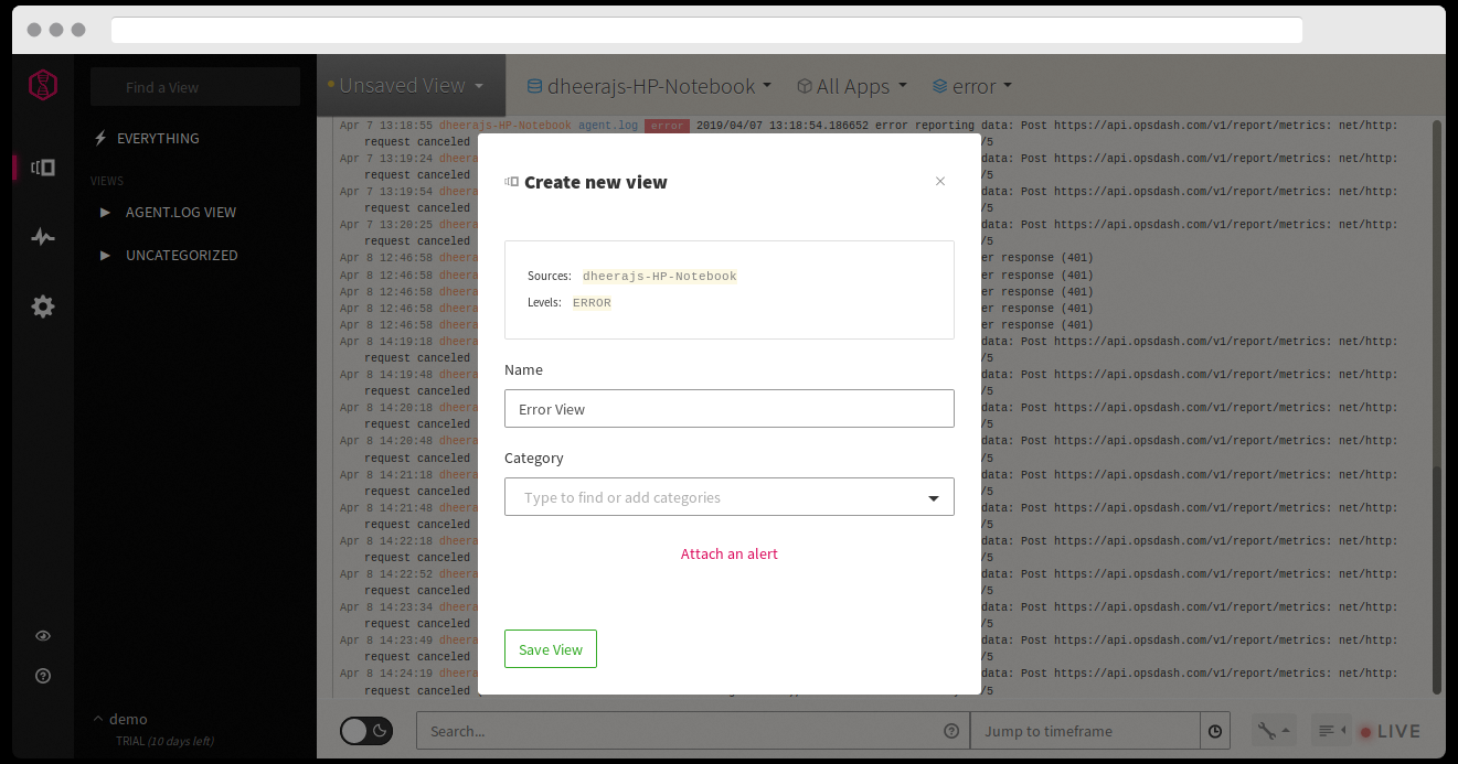 - Click Save as new view under ‘Unsaved View’ drop-down menu. Enter the view name and click on attach an alert.
