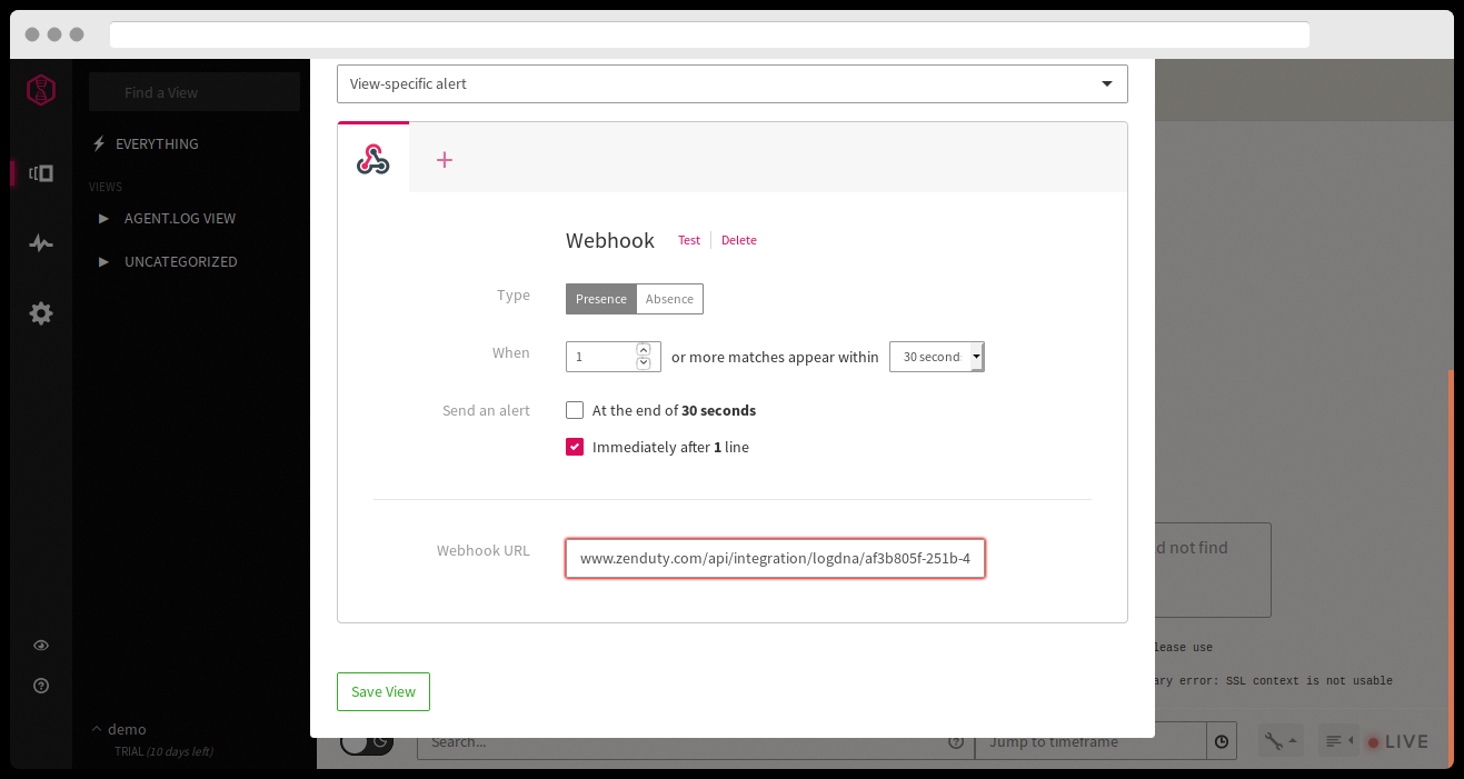 - Select ‘Immediately after 1 line’ under Send an alert option. Paste the copied link in Webhook URL.