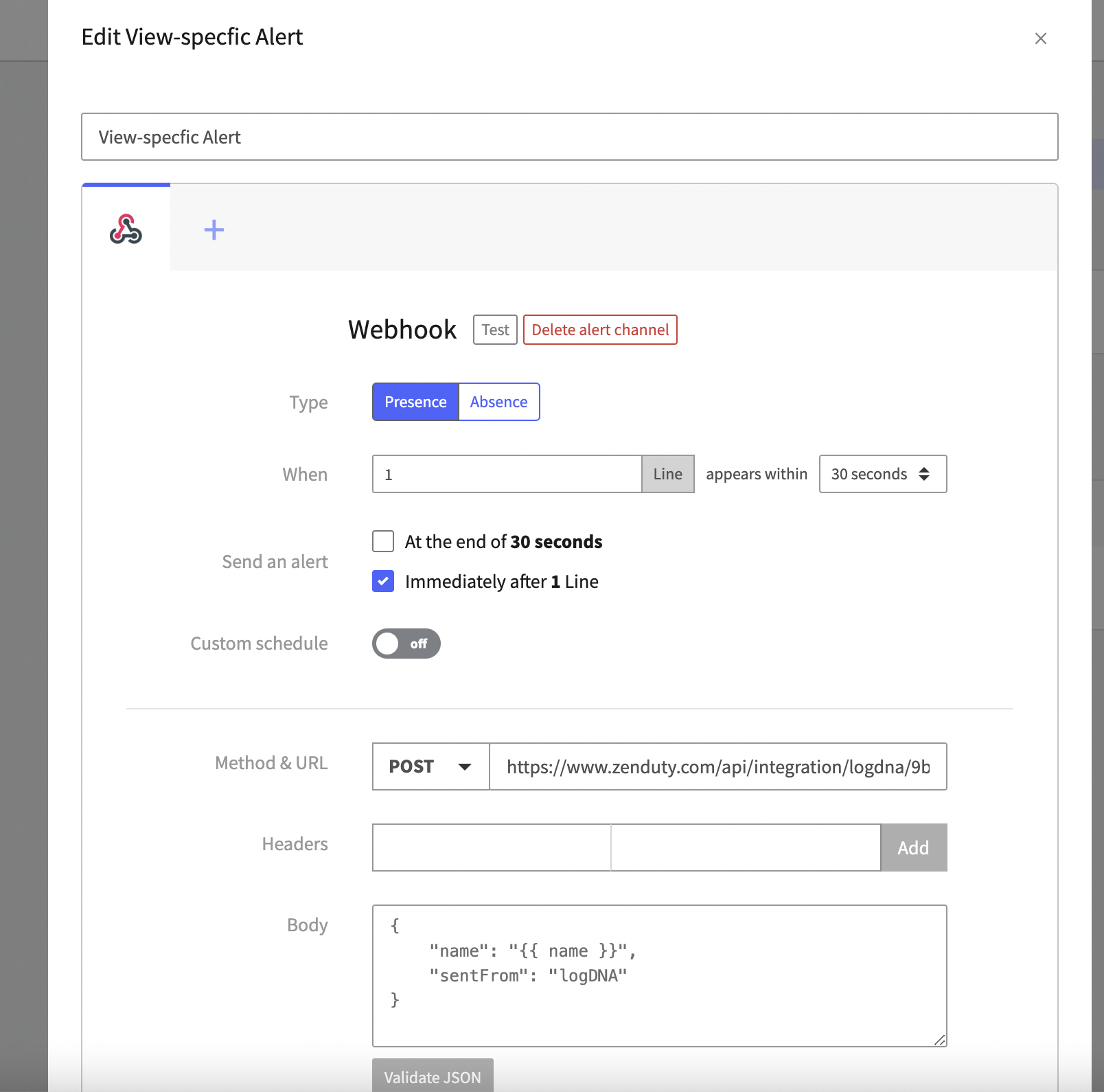 - Select Immediately after 1 line under Send an Alert option. Paste the copied link in Webhook URL and leave the Body as Empty.