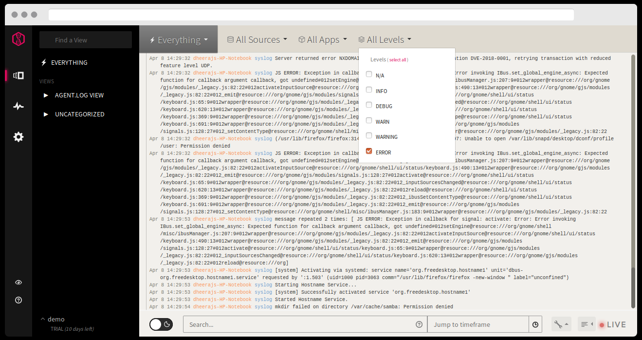 - Select ERROR from the ‘All Levels’ drop-down menu.