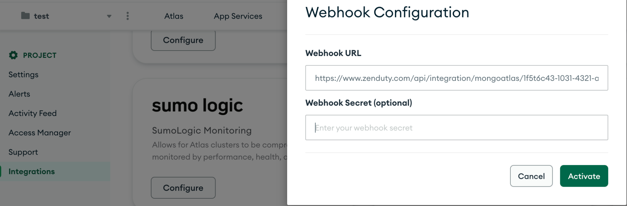- Go to Integrations and then Add New Integration. Give it a name and select the application MongoDBAtlas from the dropdown menu.