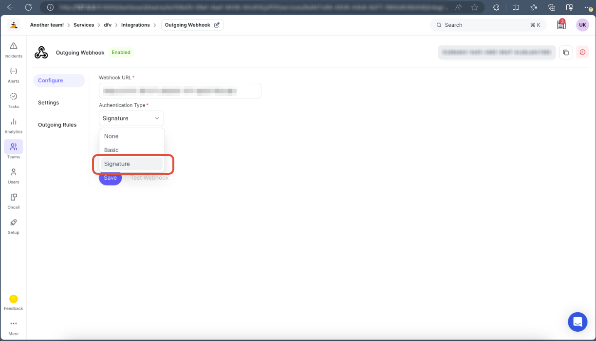 Note: Please refer to the Outbound Communication Guidelines document for the correct URL structure. - You can create an outgoing webhook integration with no authentication or authenticate it using the Basic or HMAC Signature.