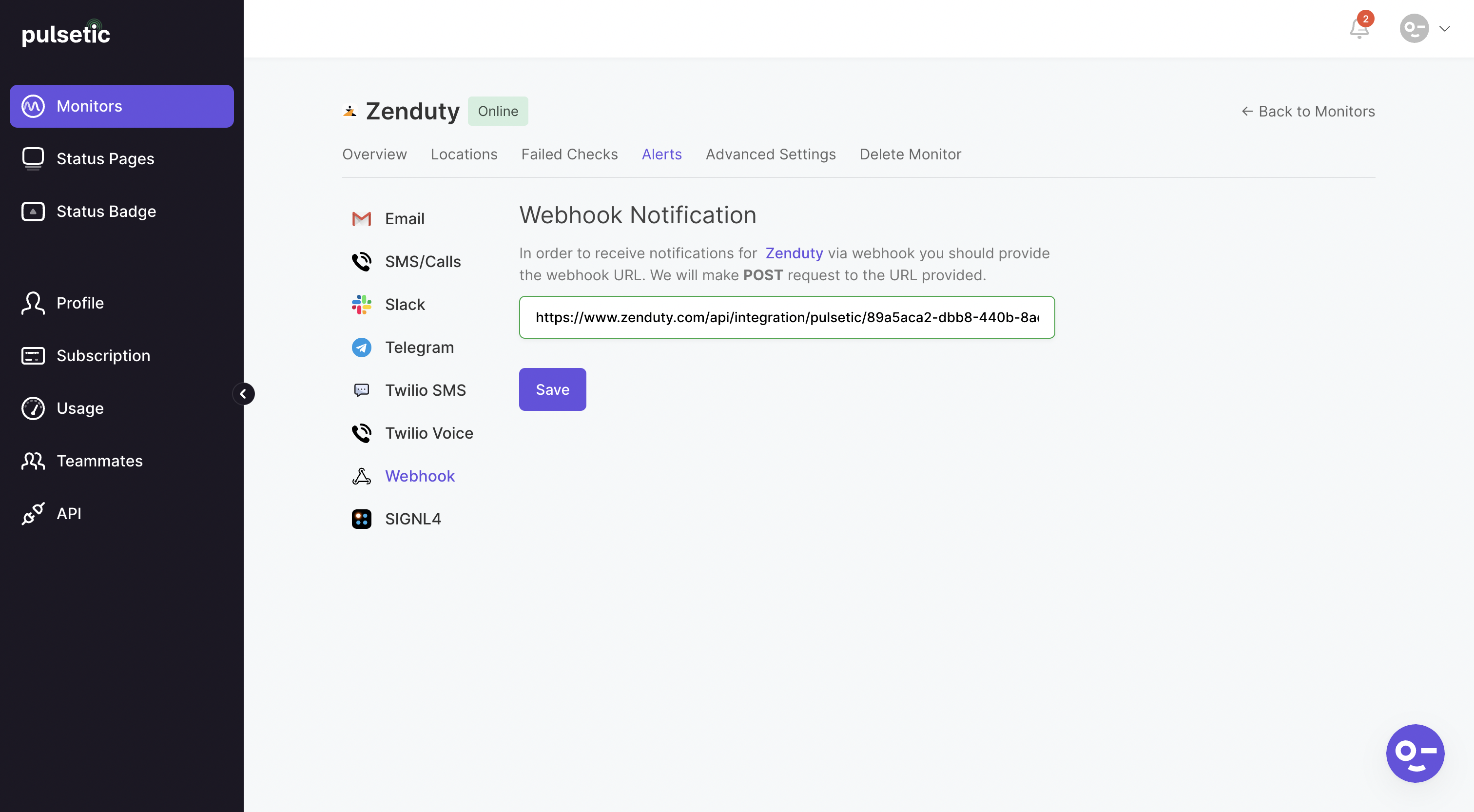 - You can now configure Advanced Settings as per your requirements and test the Webhook by sending Monitor Online and Monitor Offline requests.