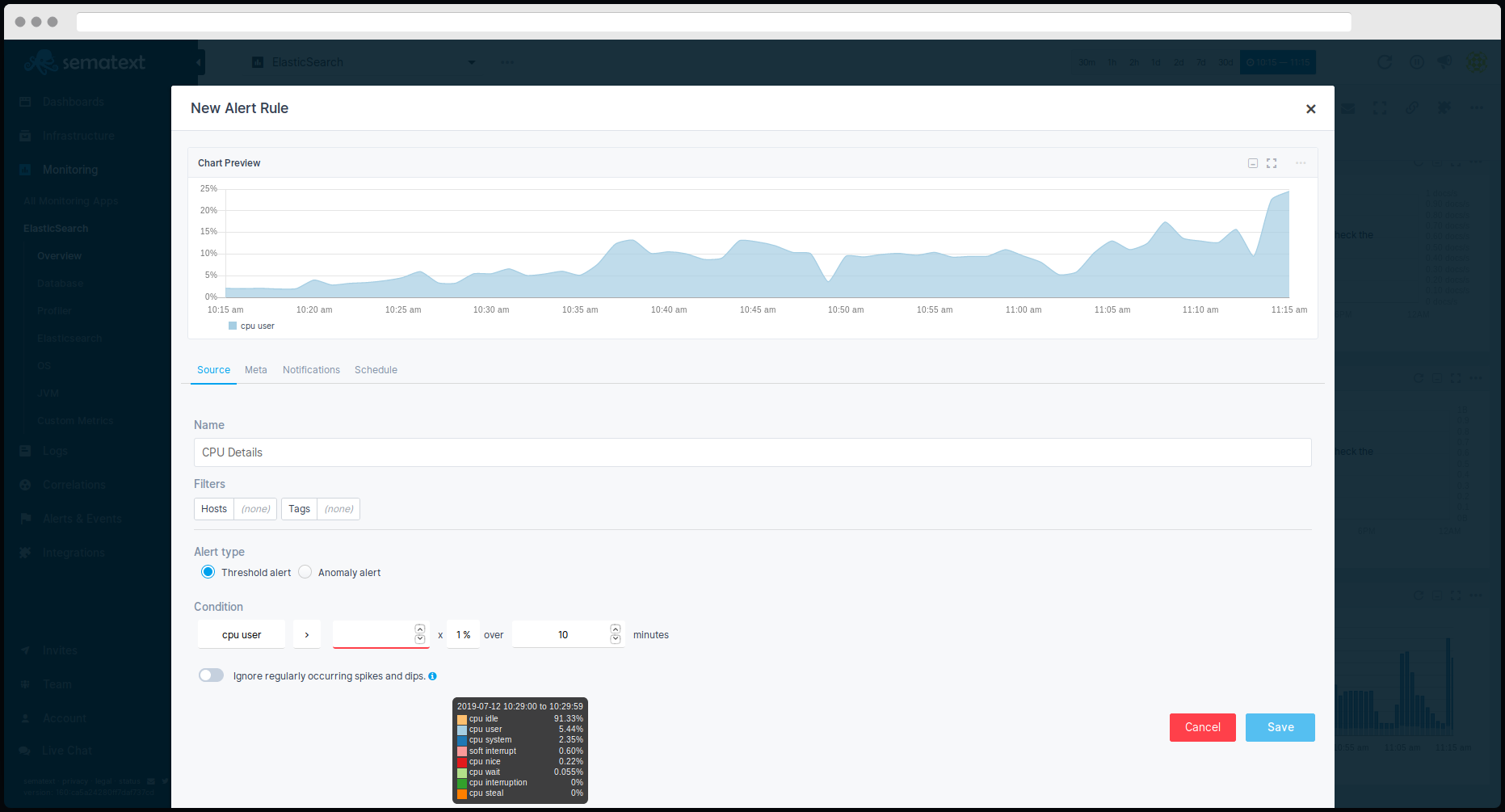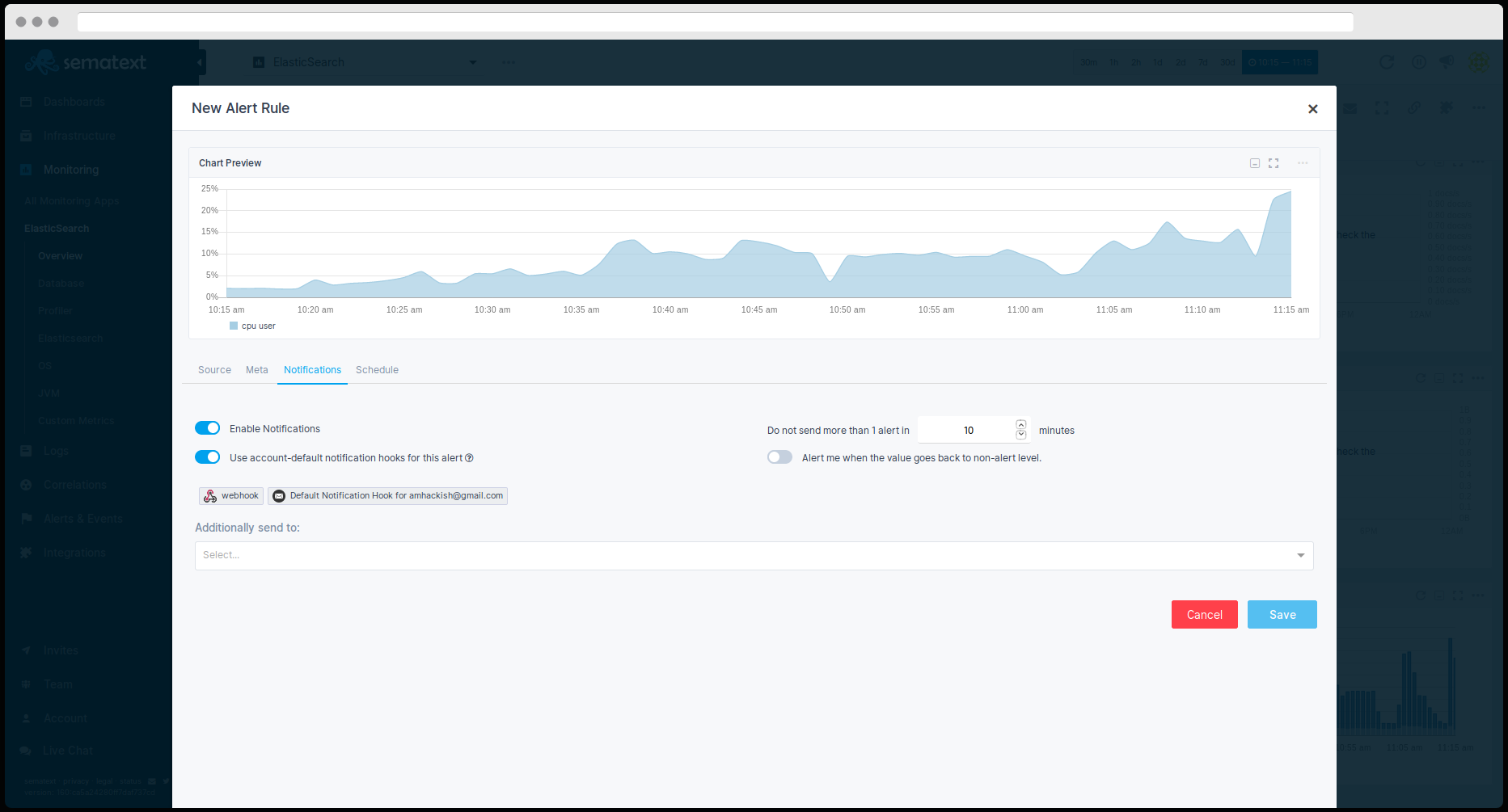 You can also use Alert Rules to custom route specific Sematext alerts to specific users, teams or escalation policies, write suppression rules, auto add notes, responders and incident tasks.