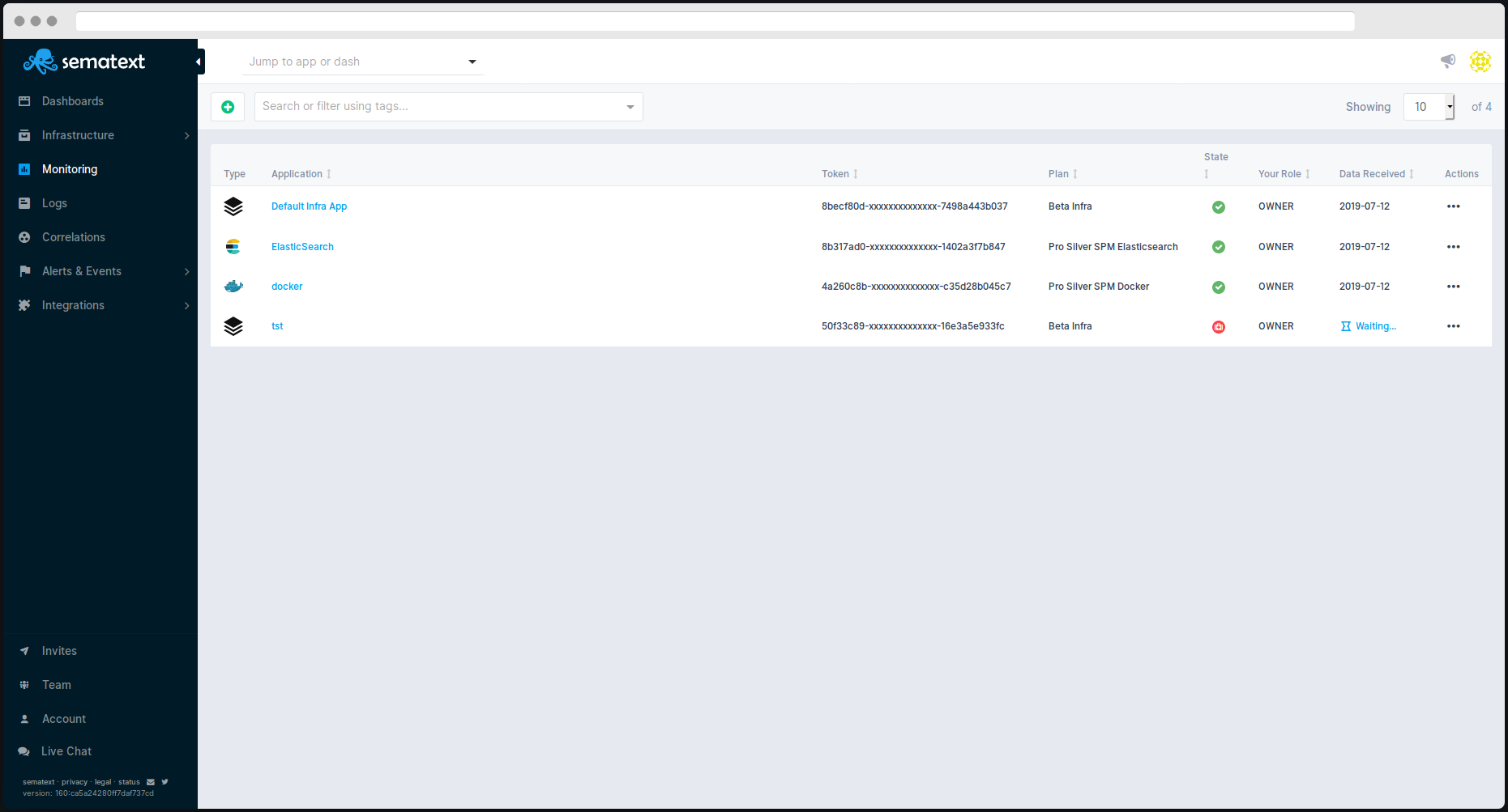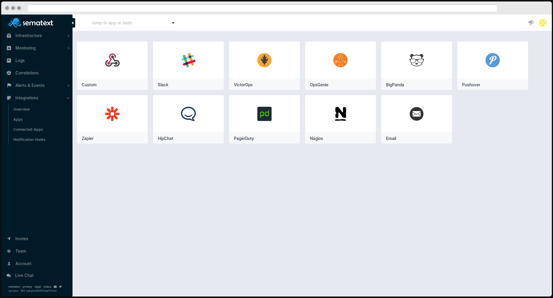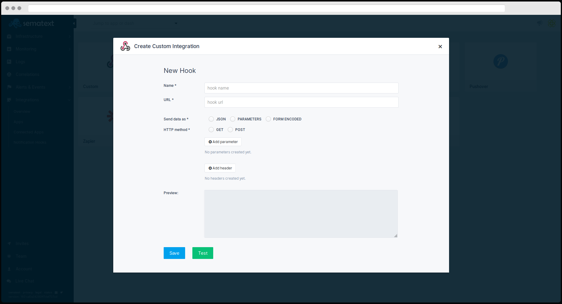 - Go to Integrations and then Add New Integration. Give it a name and select the application Sematext from the dropdown menu.