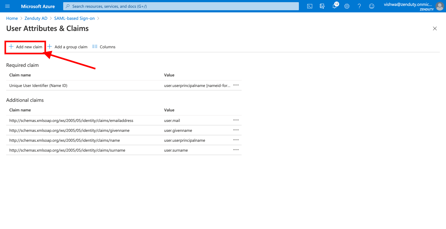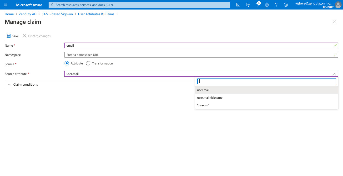 - For the first claim, click on Add new claim(Note: in case the Add new claim button is greyed out, try refreshing your page). In the Name field, enter the value email. In the Source radio options, select Attribute. In the Source Attribute dropdown, search for 'user.mail'.