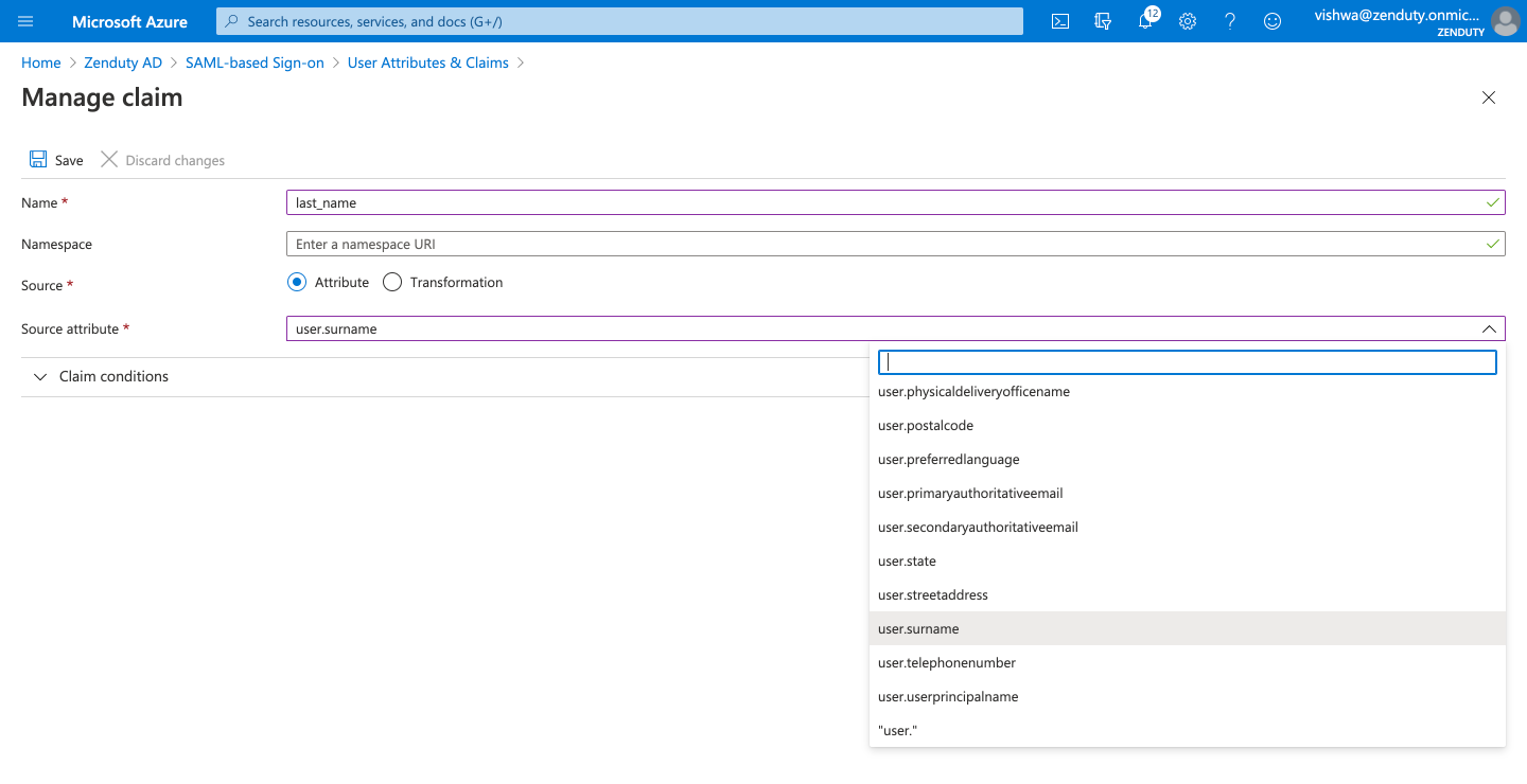 - For the third claim, Click on Add new claim. In the Name field, enter the value last_name. In the Source radio options, select Attribute. In the Source Attribute dropdown, search for 'user.surname'.