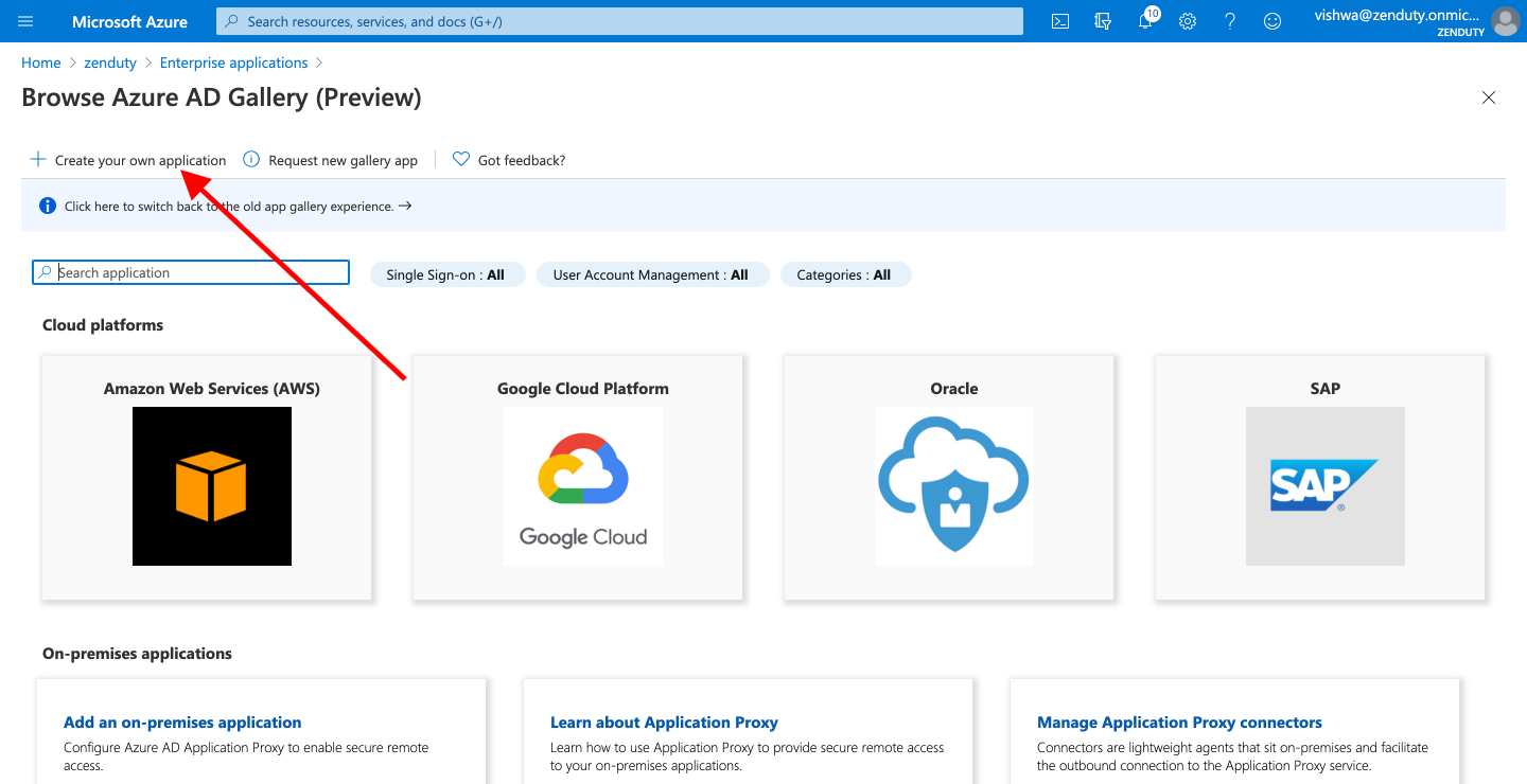 - Go to your Azure portal browser tab. Navigate to Azure Active Directory from the left vertical panel. Navigate to Enterprise Applications from the left vertical panel. Click on New application.