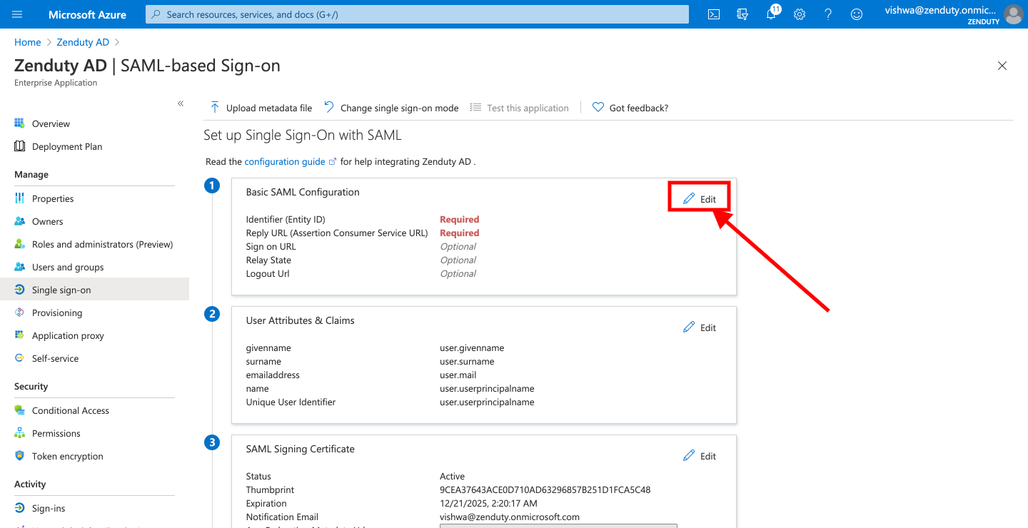 - Click on Edit in the Basic SAML Configuration area.