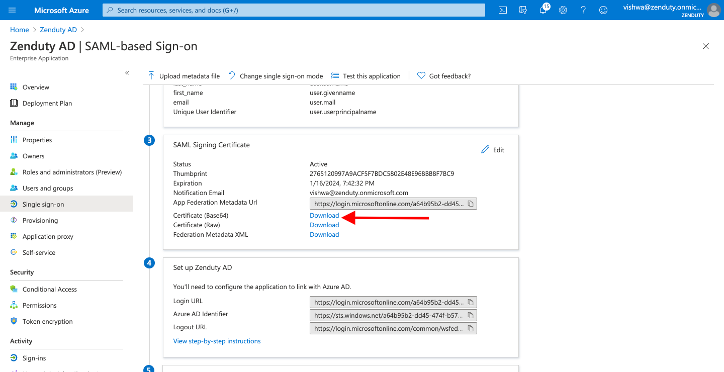 - Navigate back to the Single Sign-on page. In the SAML Signing Certificate area, click on the Download link next to the Certificate (Base64) text. Open the downloaded file.
