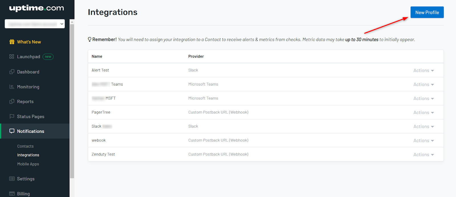 1. Log in to Uptime.com, navigate to Notifications and select Integrations.