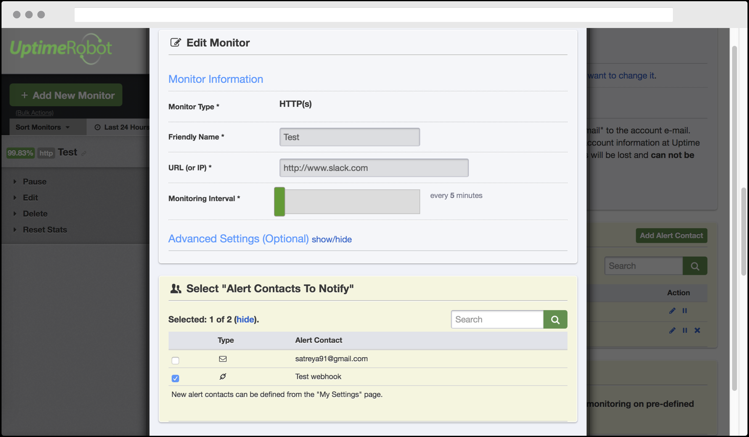 - Fill the form with the necessary details and finally check the box next to the newly created webhook in the Alert Contacts to Notify section.