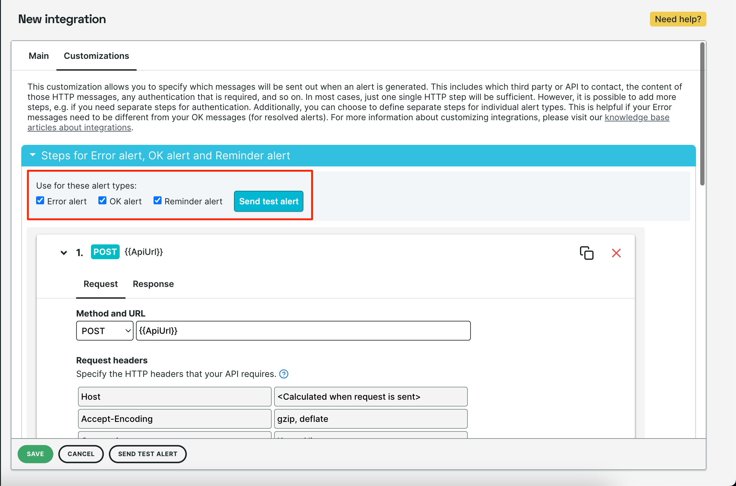 - In the alert definition, select the newly created webhook in the Alerting By Integrations section and then save.