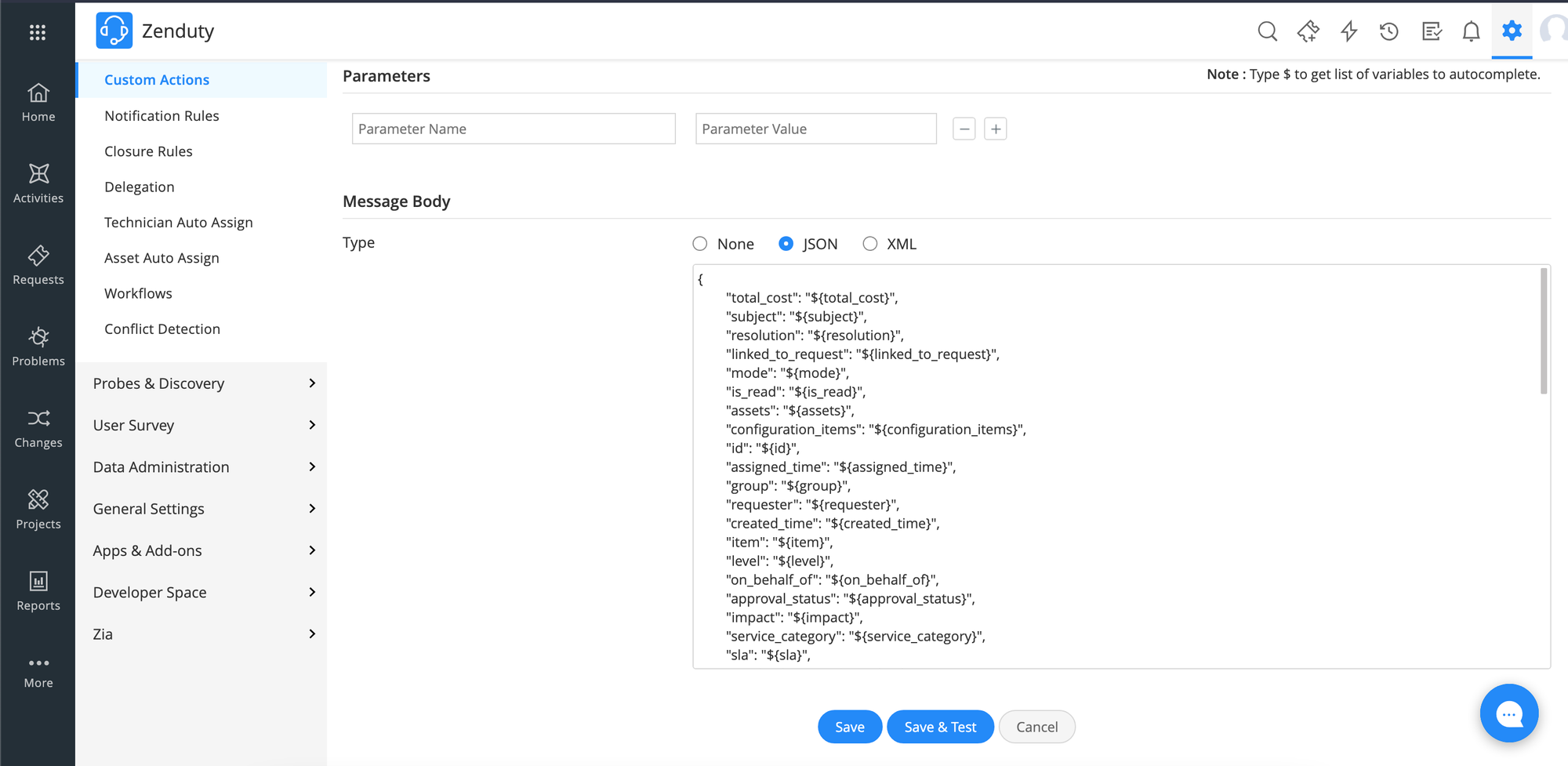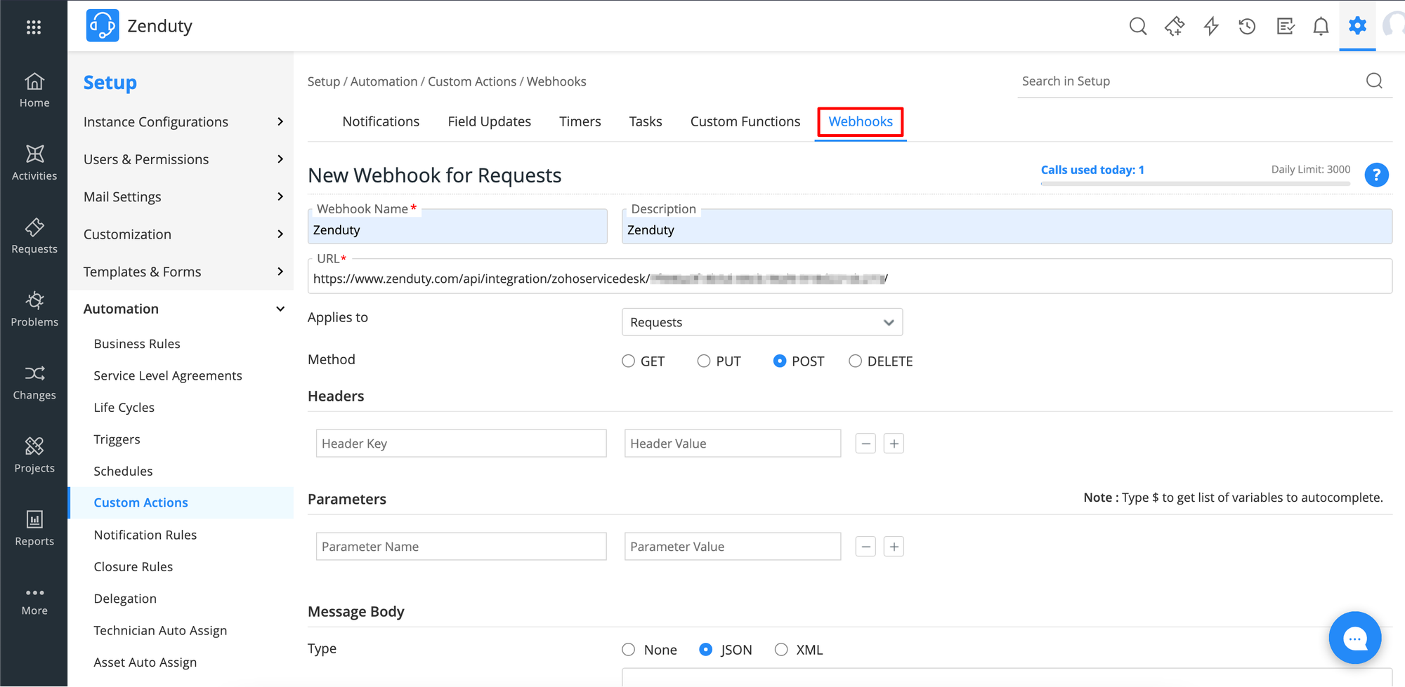 4. Fill in the name and description of the Webhook in the respective fields and specify the URL of the webhook endpoint in the URL field. Define the request method as POST in the Method field. Under Message Body select JSON as the type and provide a message body as per your requirements. There are a few fields which are required in the message body in order to create an Incident on Xurrent IMR, those fields are listed further below. Click on Save to save the webhook custom action.