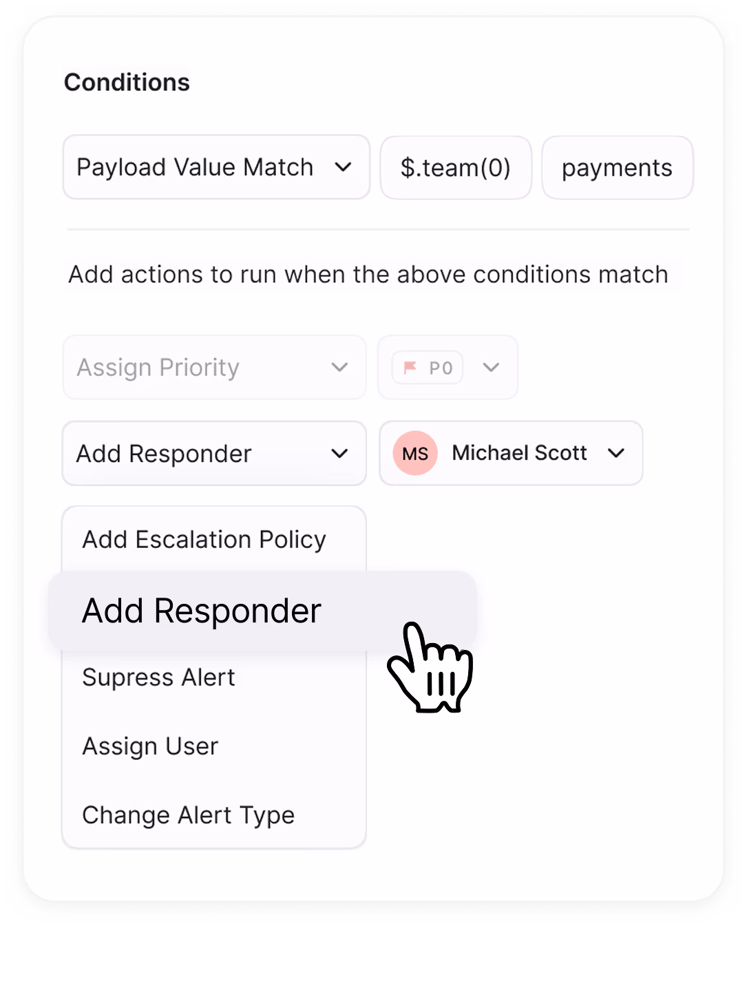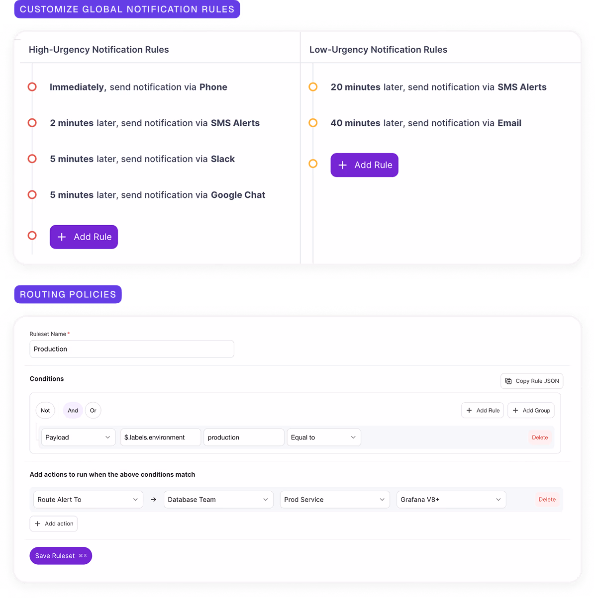 Gain full control over how alerts are processed. Create complex, conditional rules for incoming alerts based on payload, source, service, or time. Automatically route or suppress alerts and define how incidents should be generated, grouped, or prioritized.