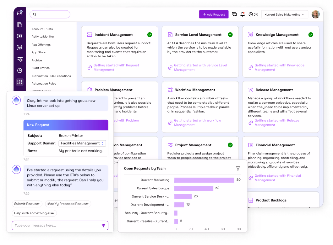 Xurrent brings these environments together into a single platform, giving leadership clearer insight into performance while making it easier for teams to collaborate and scale service delivery across the organization.
