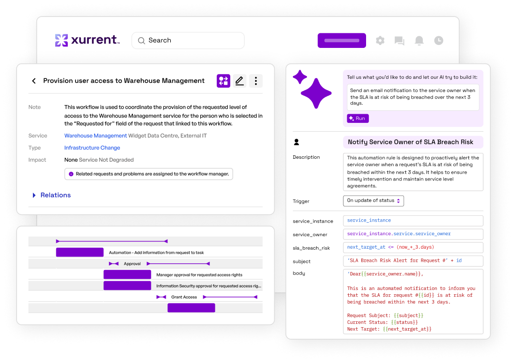 Automate repetitive service requests and operational workflows without relying on development resources. Xurrent enables teams to streamline processes, reduce manual effort, and scale operations efficiently across the business.