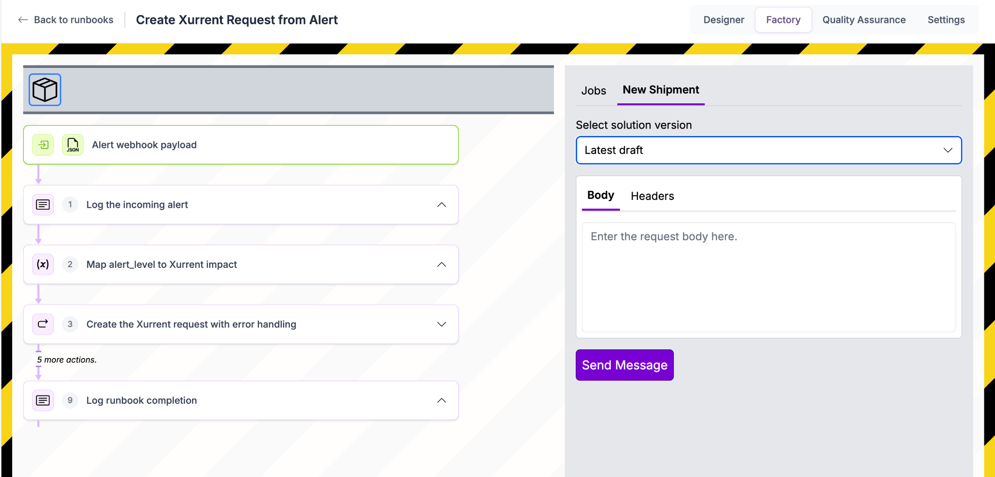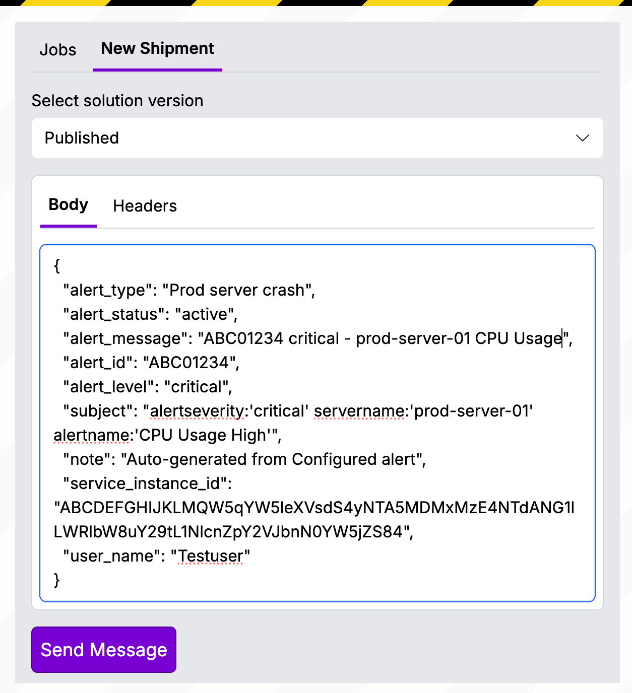 • New Shipment: Use this tab to send test payloads to the runbook.
